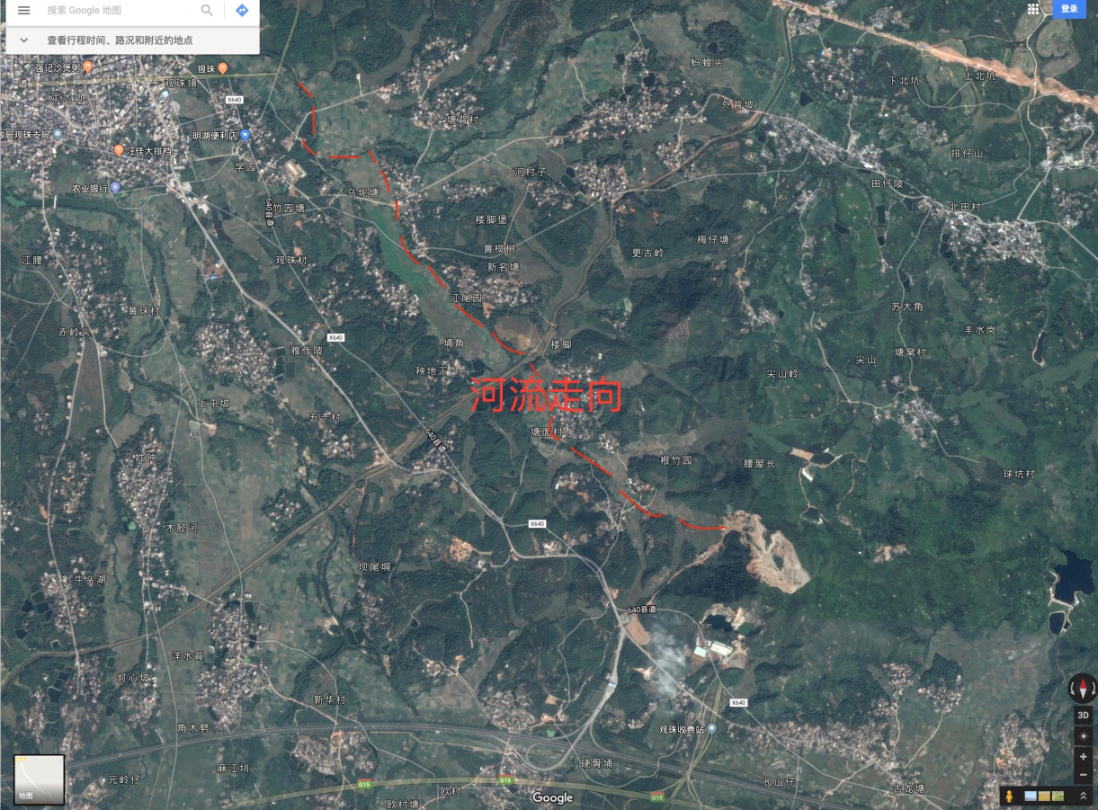 看上图,这是流向观珠墟的两条主要河流之一的源头。从大角岭一向观珠墟方向流经根竹园,热水湖,楼脚,黄榄树等,从用水来讲基本涉及整个五一片区,红光片区,观珠墟片区。