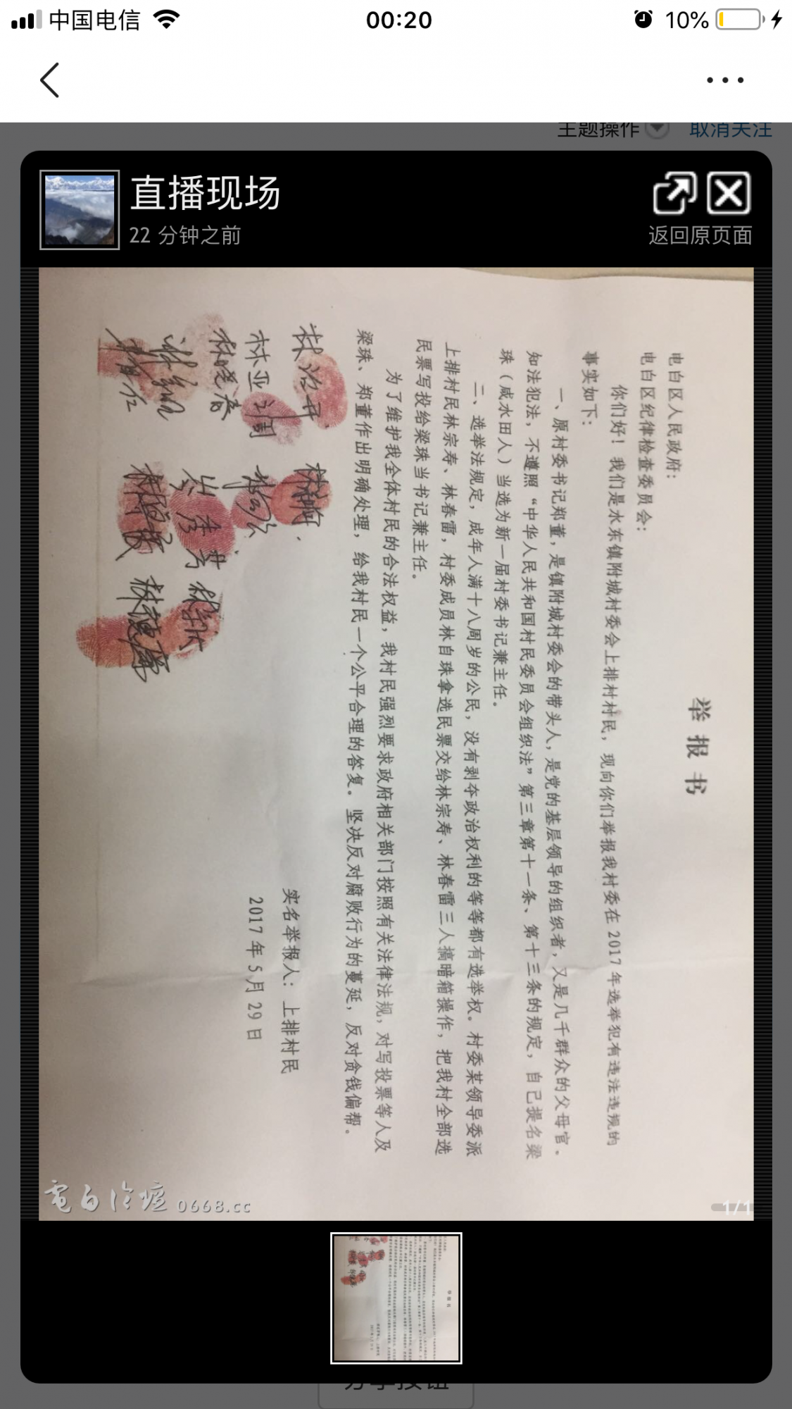 现公布违纪选举在职人员:梁珠为附城管区书记兼主任,林自珠为附城管区办事员,林宗富为上排村村长且多年违规暗箱当任,既当村长又当出纳现已三届从没有公布村数目,涉嫌贪污违规选举已引全上排村民民愤! 直播现场 说: 证据是全上排村村民,让纪委巡视组下来上排村核查是否发选票到各村民手中选举!附上排村民!举报书 点击展开...