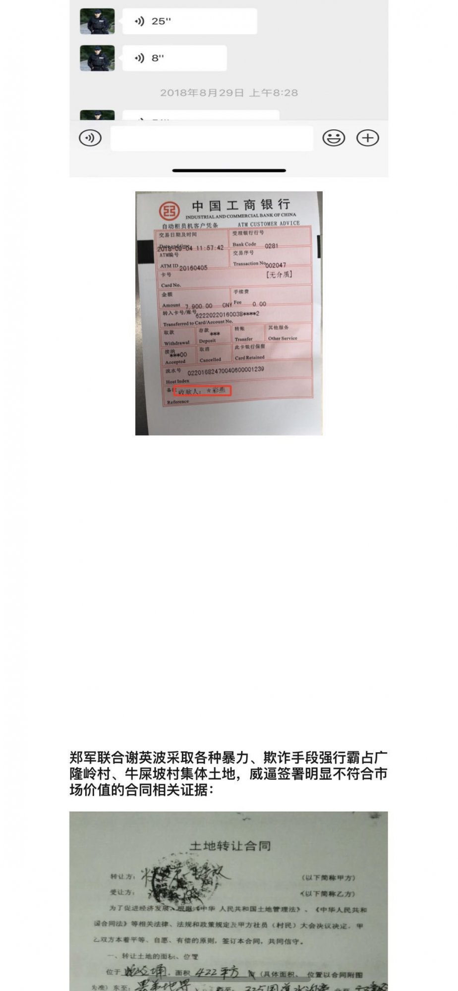 2、 违法霸占村民集体土地,私自收租:郑军在2014年联合谢英达(金刚)胞弟谢英波采取各种暴力、欺诈手段强行霸占广隆岭村、牛屎坡村集体土地用于出租给茂名市鼎兴汽车贸易有限公司,月租金8000元。鼎兴汽车法人代表李良已亲口承认该租金每月由郑军本人收取,有相关微信截图、语音作为证据。李良手机号码:18576270983。谢英波妻子也承认,在其丈夫被拘留阶段,该土地的租赁事宜全权由郑军在负责操作。谢英波妻子手机号码为:15999902286。
