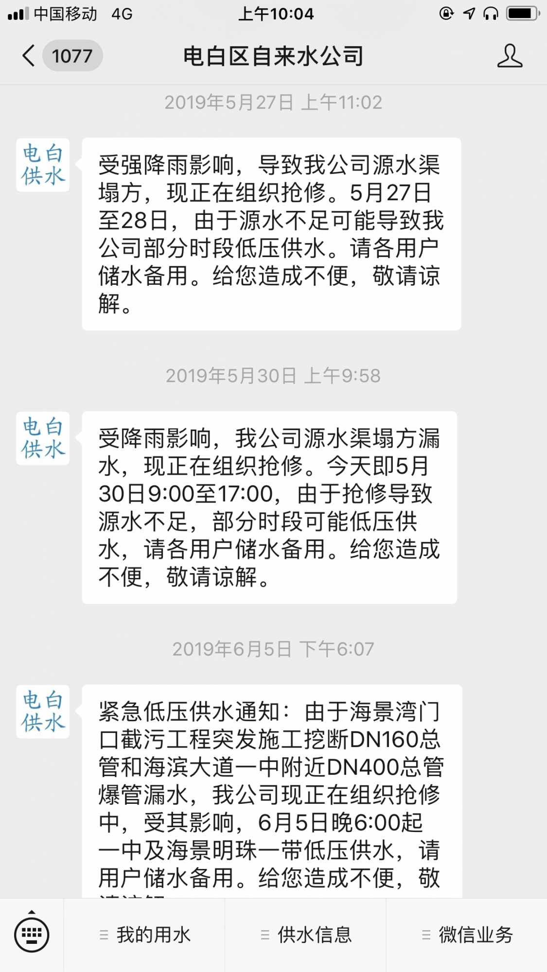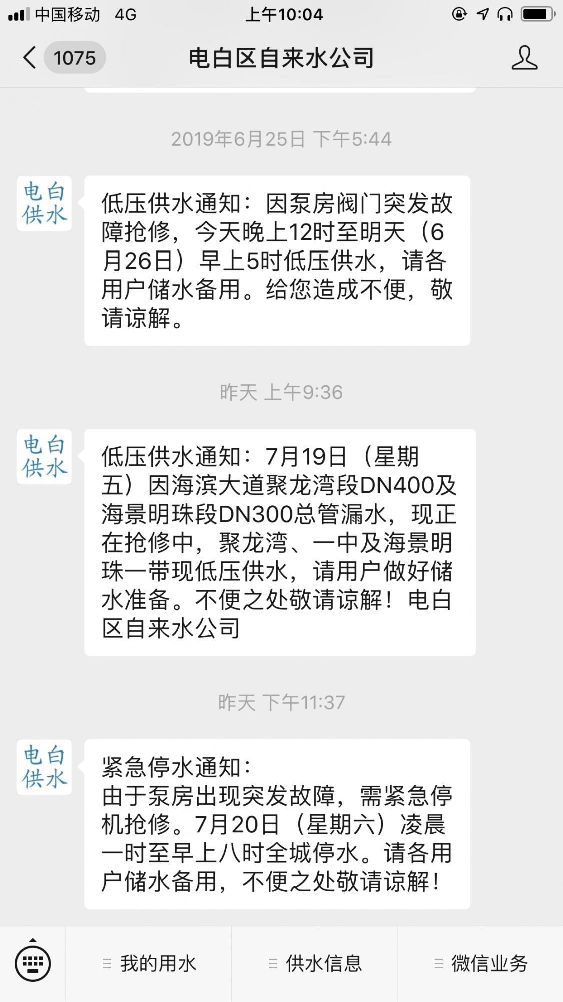 S shalaoscnu 幼儿园 注册 2005-11-25 消息 7 反馈评分 0 点数 0 2019-07-20 #1 最近天气炎热 洗个澡应该蛮舒服的 可为啥这段时间老是停水呢?白天停,晚上停,深夜也停,机房机器故障、水渠塌方诸如此类的原因……水东自来水公司,能给居民一个满意的答案吗? 附件 88C575C9-C44C-4953-A802-DE4C69CCF3E3.png 893.7 KB · 查看: 473 43896980-318C-40ED-BB9C-2B562A069A55.png 976.1 KB · 查看: 477