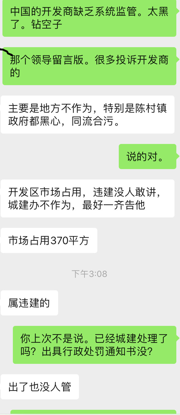 油 油盐白粥 幼儿园 注册 2019-08-19 消息 10 反馈评分 1 点数 0 性别 男 2019-08-19 #1 村民们举报陈村开发区市场违建,占用公共土地370平米,4月19日已经责令整改了,但是违建继续,城建局监督不力,执法不严,行政不作为!!
