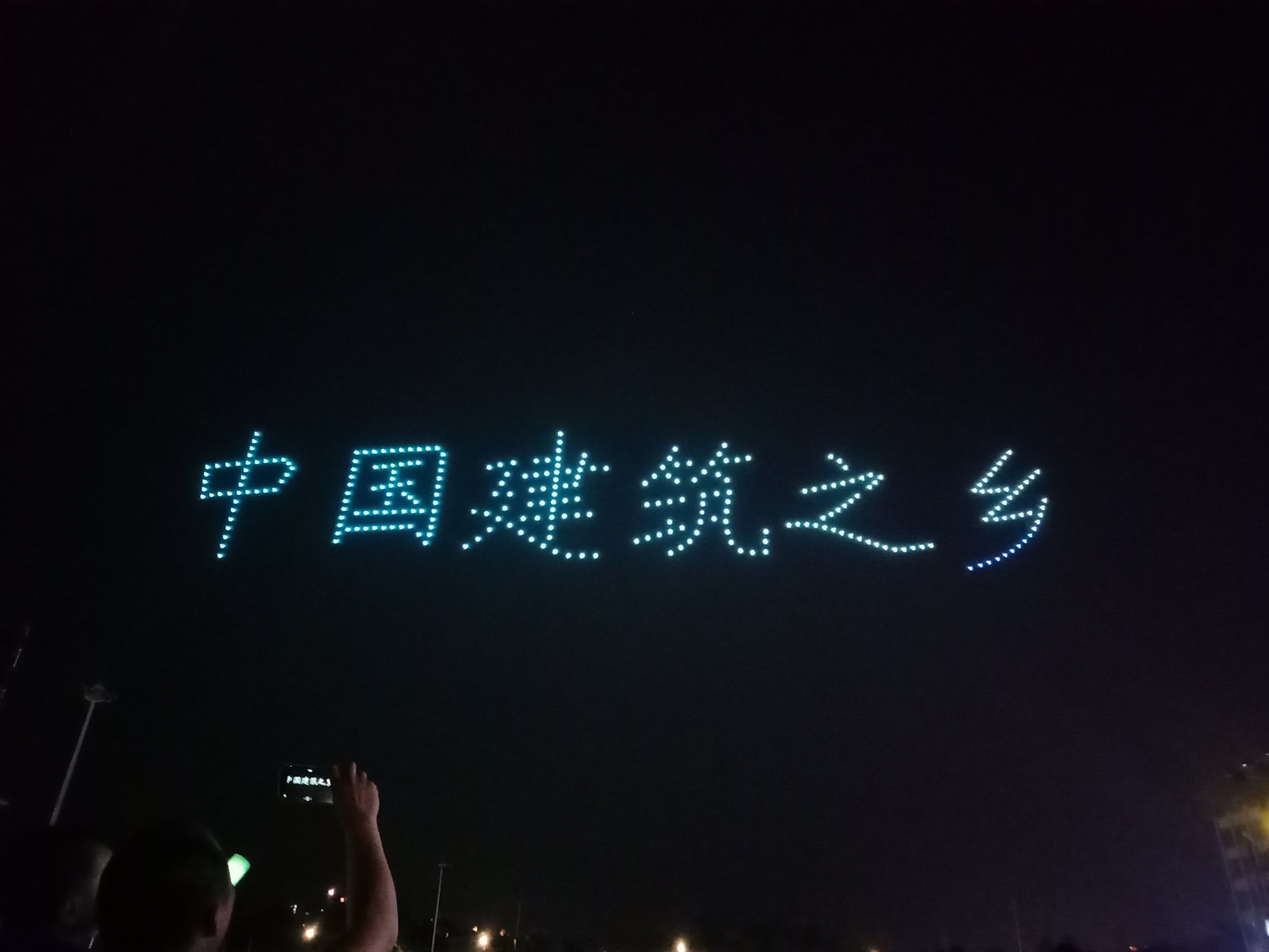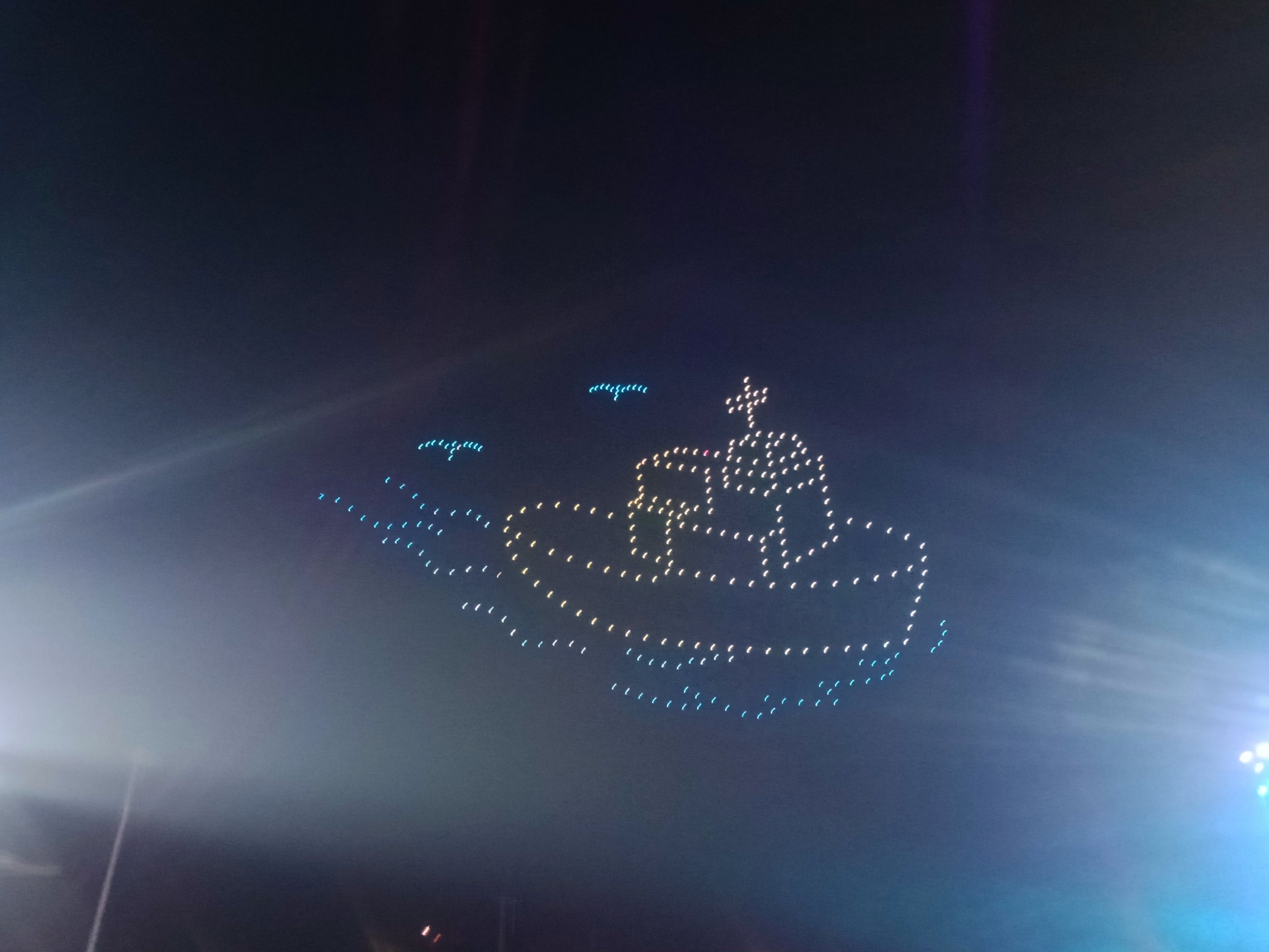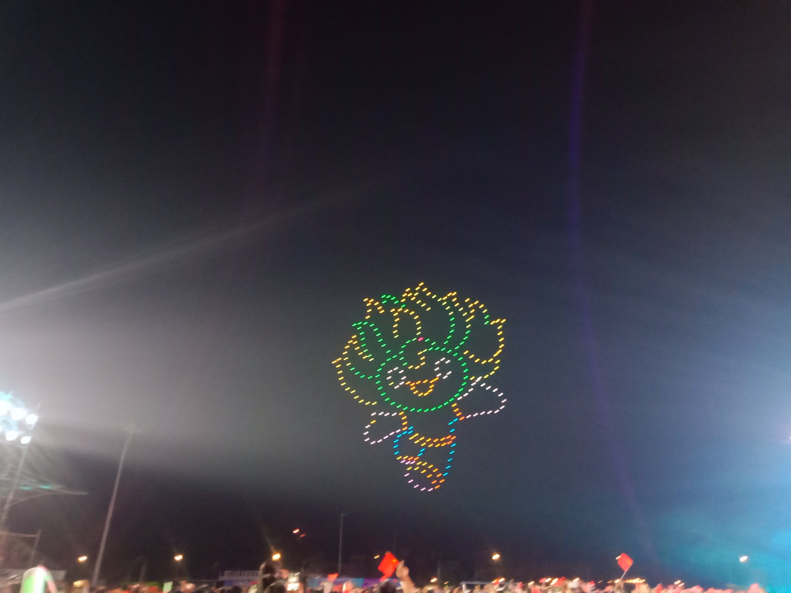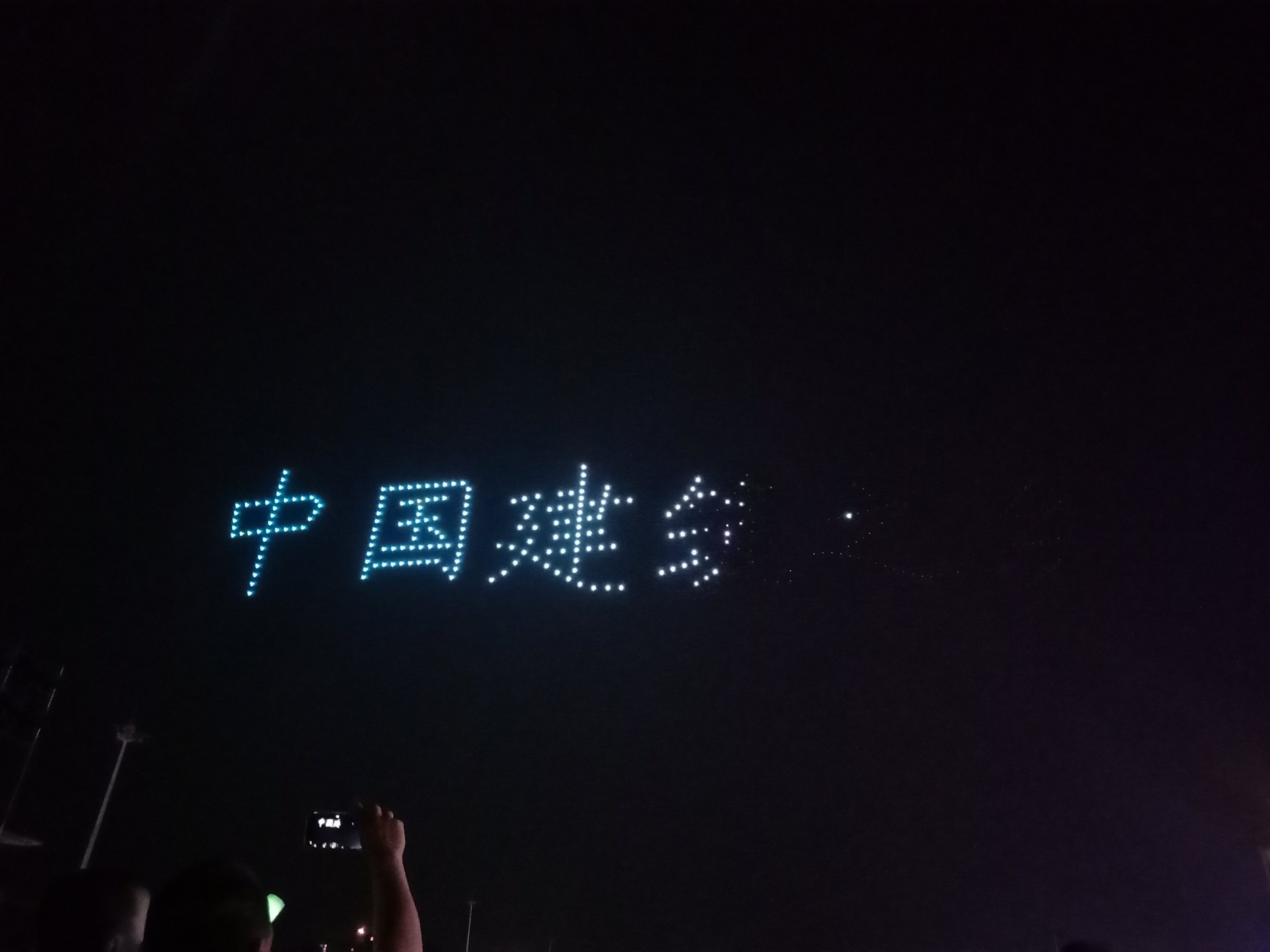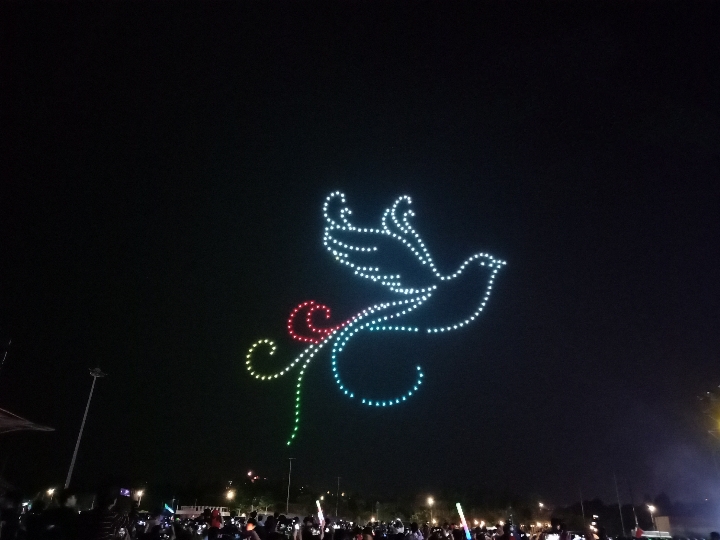 接昨晚晚会的情景,随主持人说晚会接近尾车,而这时天上又升起无人机景像