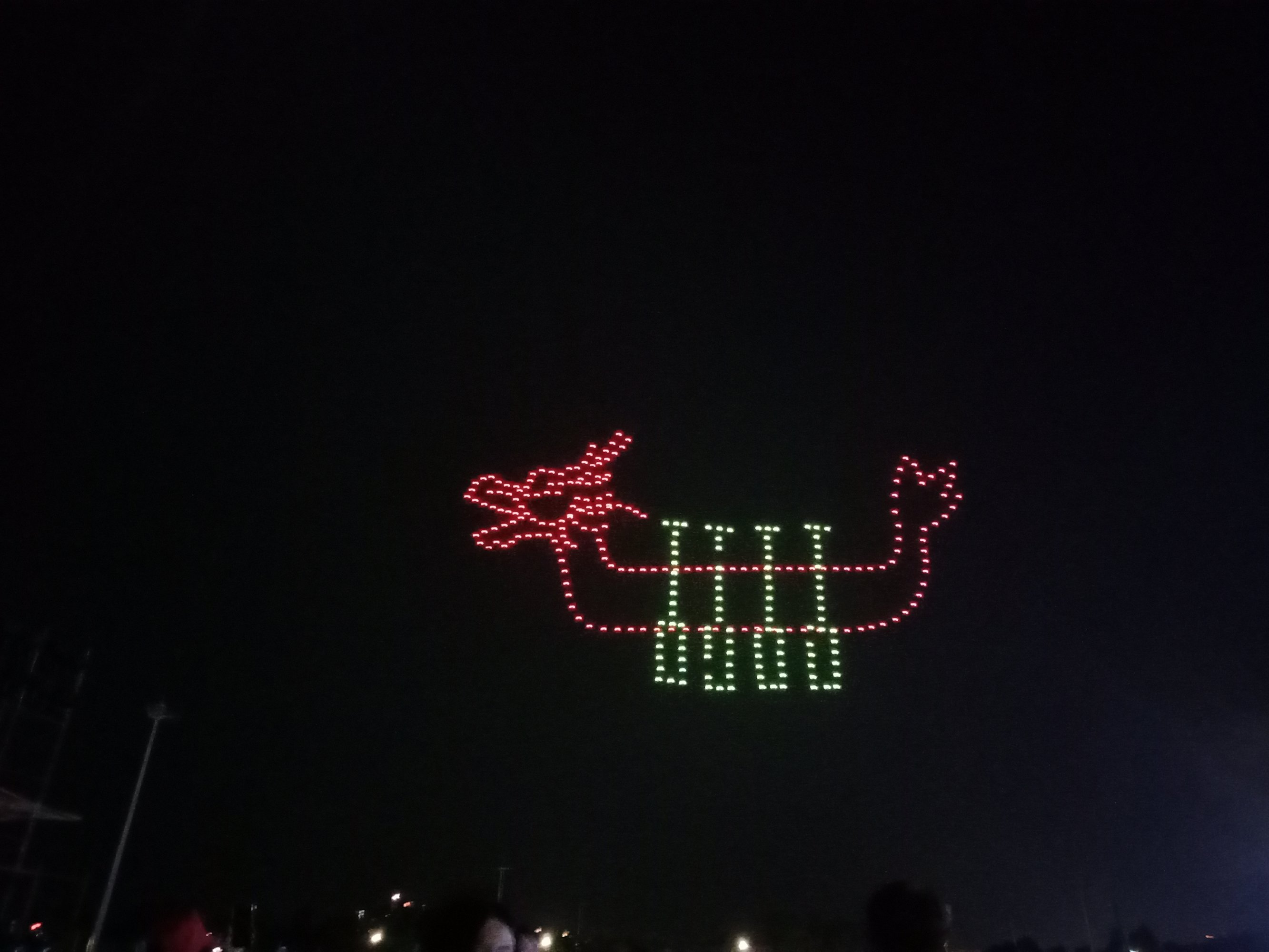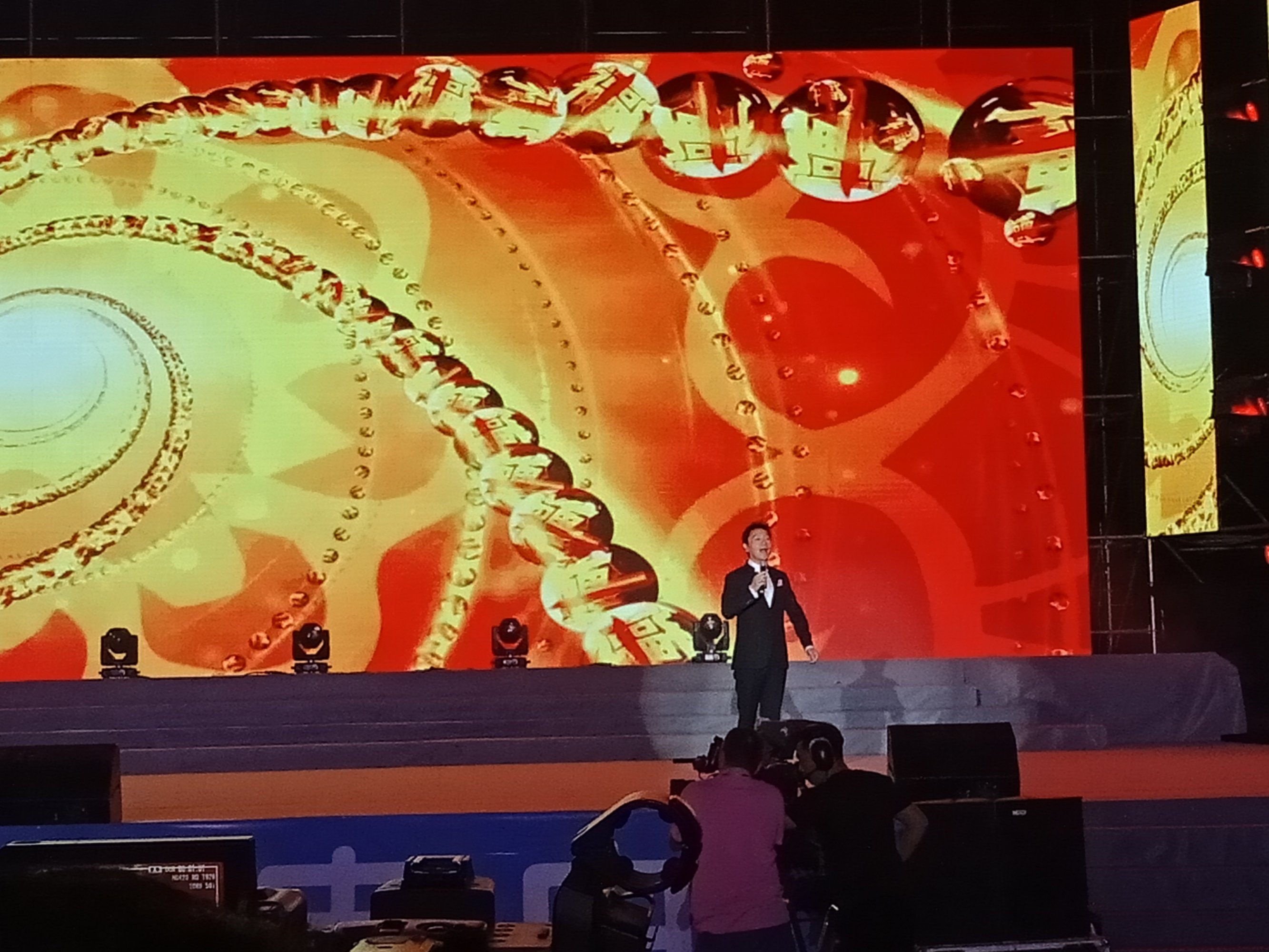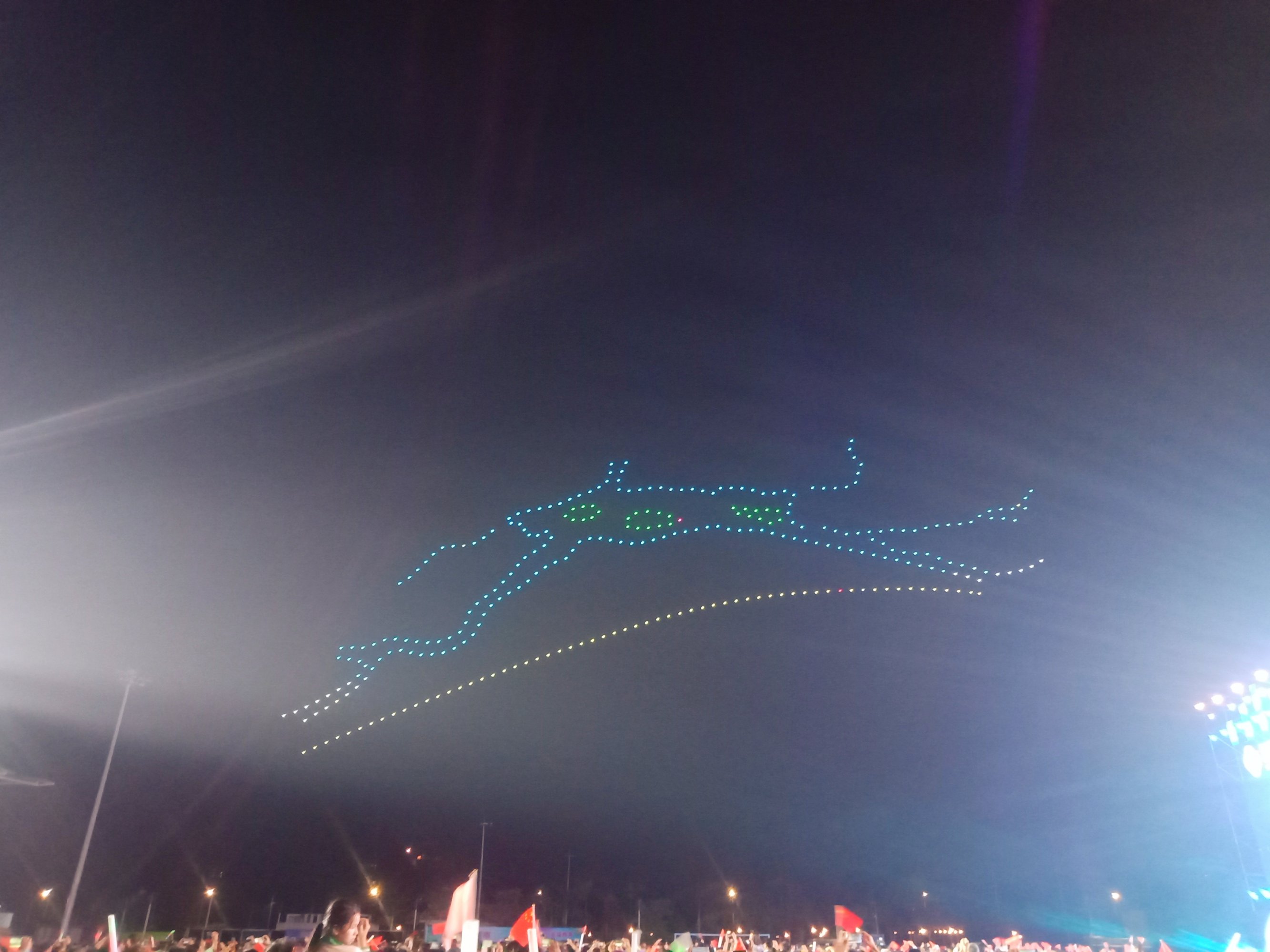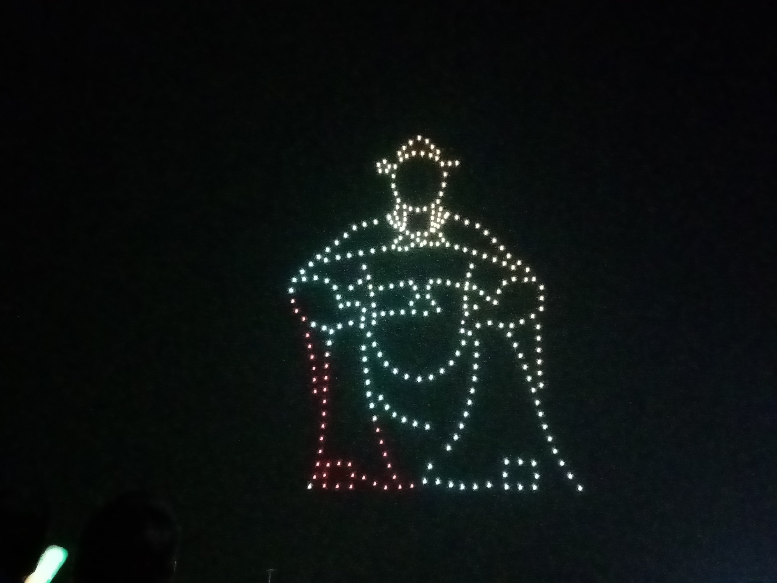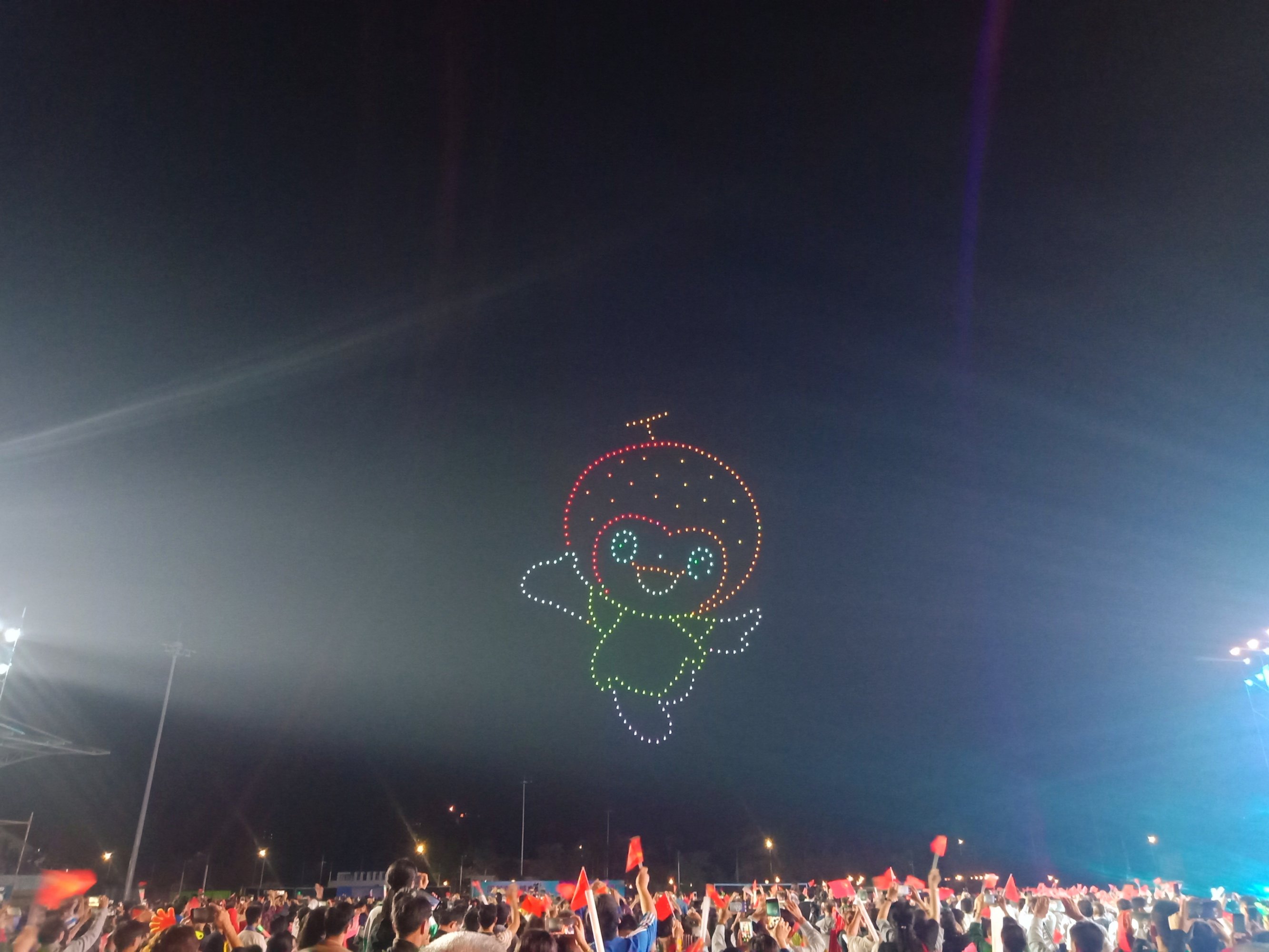 接昨晚晚会的情景,随主持人说晚会接近尾车,而这时天上又升起无人机景像