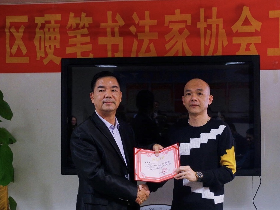 会上,领导们作了重要讲话,市硬协主席刘伟华作了发言,刘主席寄语厚望,感谢几年来大家的努力付出和支持,以后会在自己力所能及的情况下支持硬协的发展,希望硬协在李国洪主席的带领下作出更大的成绩;原区硬协主席黄义敦也作了发言,感谢市硬协领导一如既往的支持,使区硬协发展壮大,也希望硬协所有成员在李主席的带领下更上一层楼;市硬协副主席林文提出硬协不但要从硬笔出发还要把软笔也要提高,鼓励大家多交流学习,提高自身水平;市硬协副主席杨文辉提出现在中小学生汉字书写的问题,提到硬协要“写好中国字 做好中国人”的精神弘扬光大。