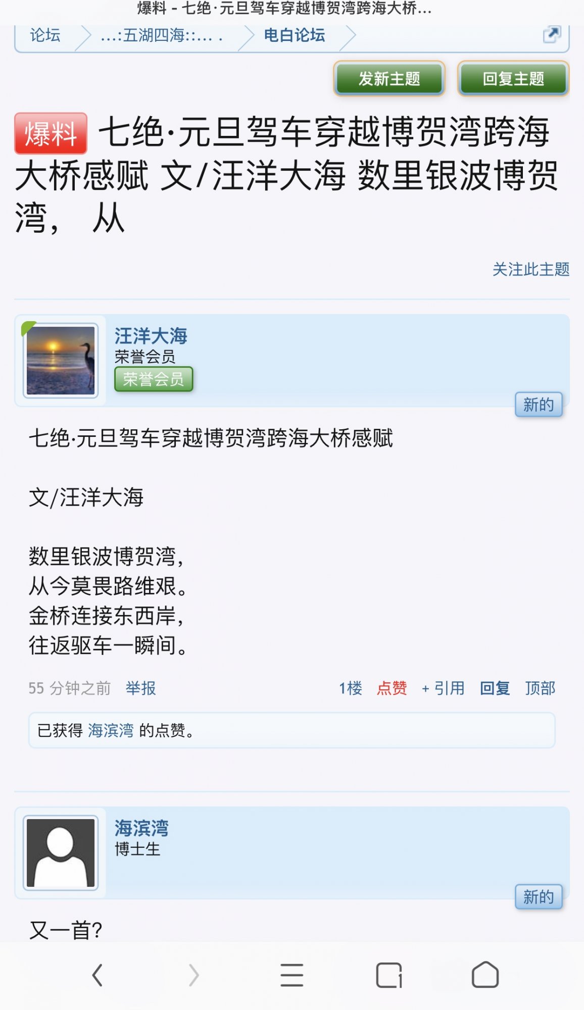 电白论坛这么多娱乐学习交流板块不去吟诗会友,非要在这个板块写诗霸屏。什么吃喝拉撒都得来趟高潮迭起,必出五绝七绝。那么多网友反感你的诗,没那个吟诗贴不冷嘲热讽你写的东西难道不觉无趣吗?你曾经不是也觉得某村的帖子多嘲讽人家,现在你都霸屏了就不会觉得不好意思吗?写诗分享拿点精品出来讨论好不好,或者像孔婆那样出手必射精,你去探亲戚买点水果都会挑点好的给人家吧,真不知道怎么说你好了,再过半月其他时事贴都被你诗词歌赋给挤到月球了。
