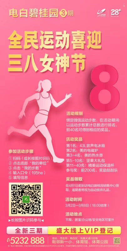 W w2365554 幼儿园 注册 2020-03-01 消息 12 反馈评分 0 点数 0 2020-03-02 #1 【电白碧桂园·3期】 全民运动 强体质 赢大奖 跑动喜迎三八女神节 电白人的都市生活大城 全新三期 盛大线上VIP 登记 联系方式:15626485034(微信同号) 附件 微信图片_20200302205335.jpg 57.8 KB · 查看: 402