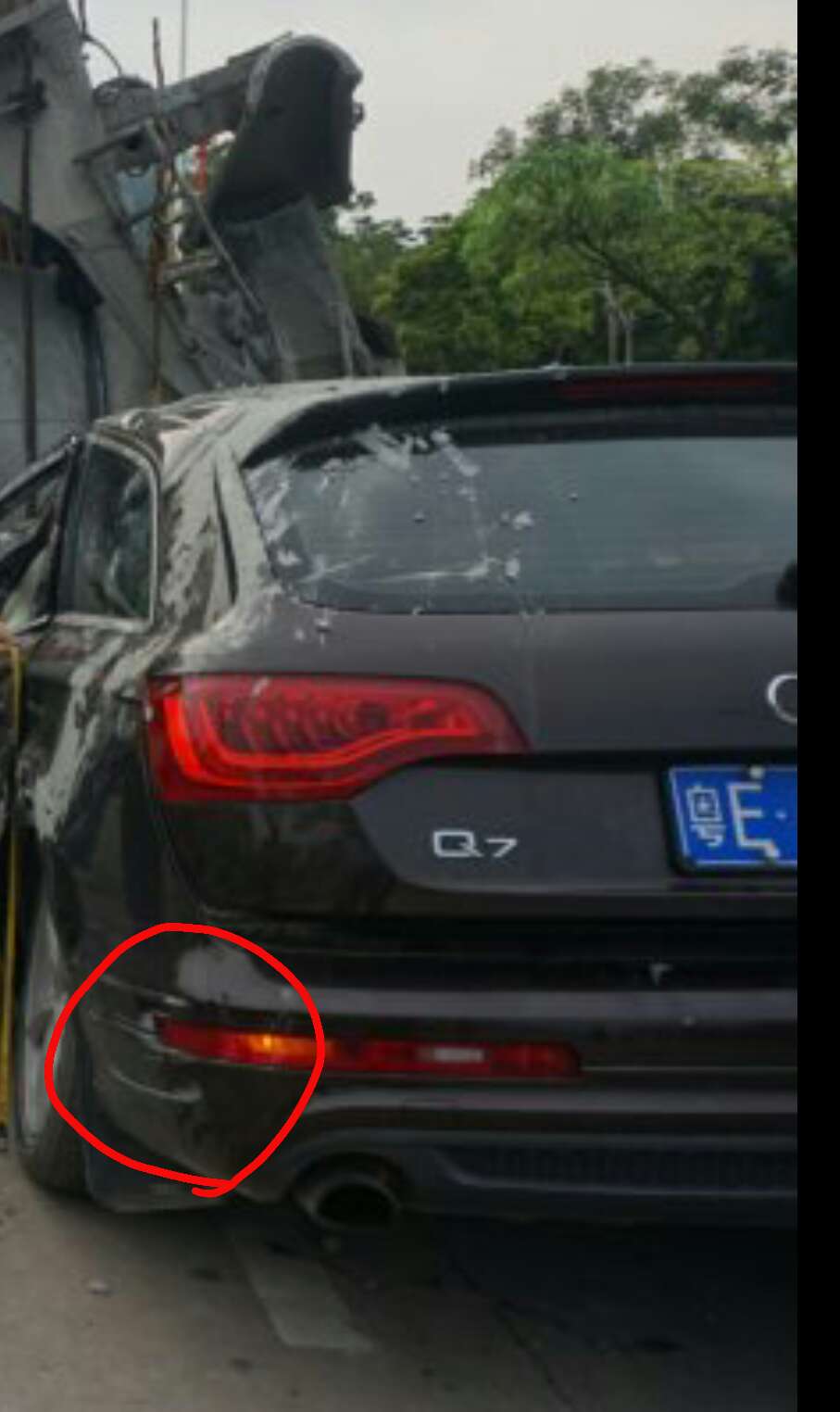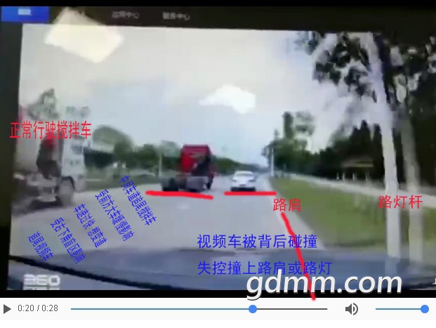 也有可能与左道的货车相撞后,货车冲上花基导致侧翻压扁了小车