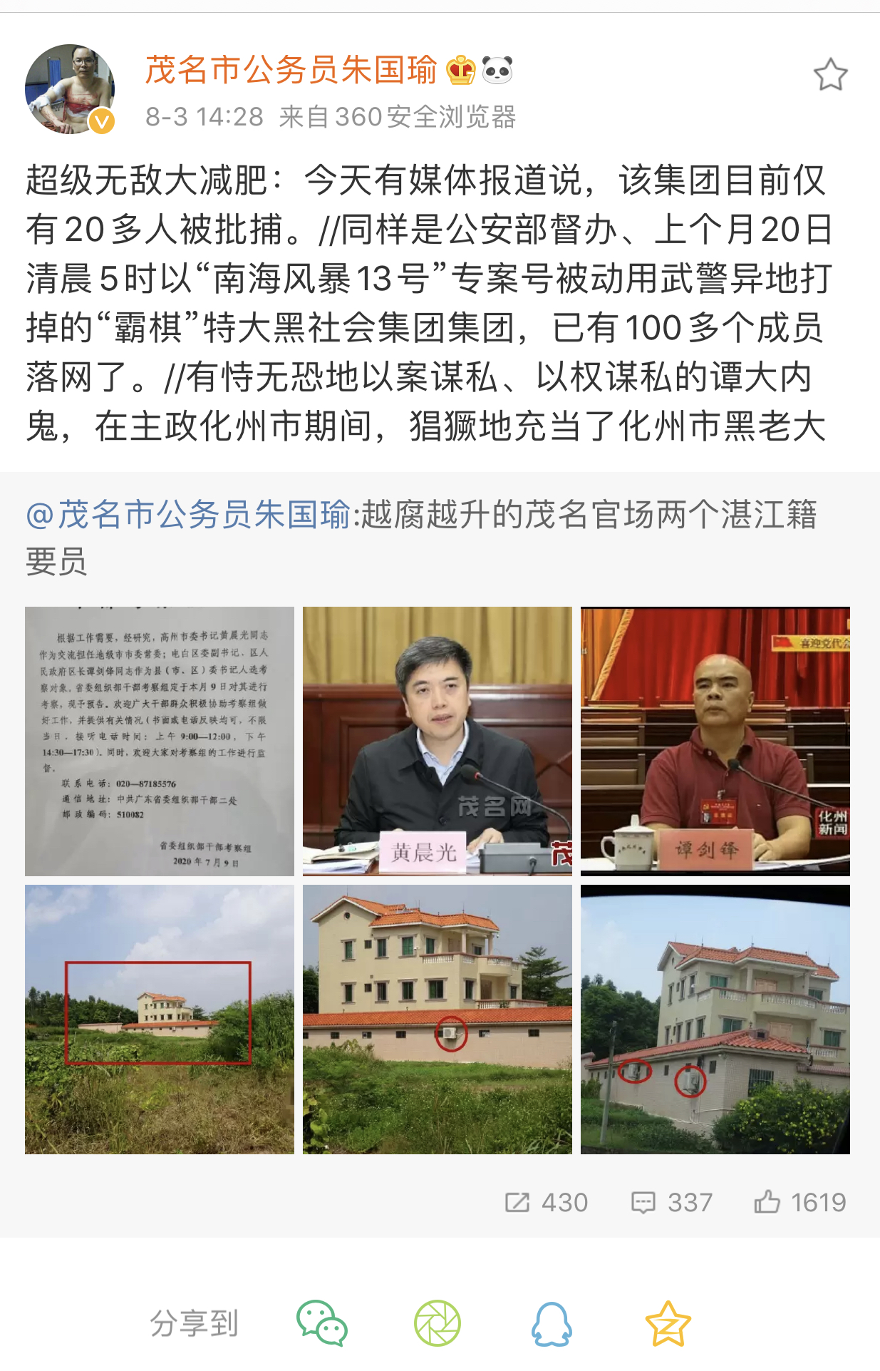 化州特大涉黑团队,霸棋团伙落网跟光头强有关联无呢??刚在朱科微博回来,有点好奇