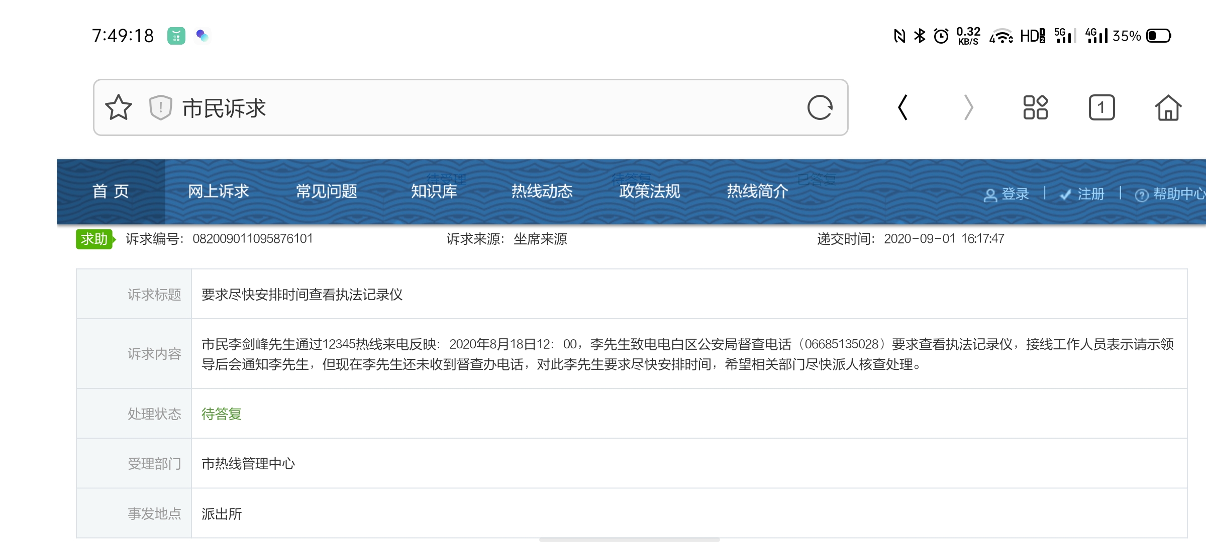 9月4号,上午大概10点,我再次联系督查室,告知12345的回复内容,督查室回复对于这个网站的回复,他并不知情,稍后再向领导询问是什么回事。我表示感激并再次提出查看执法记录仪视频,此时,督查室警员告知我,在内部调查时候,旦场派出所告知,7月25号的当天,执法记录仪没有电,没有记录保存视频。