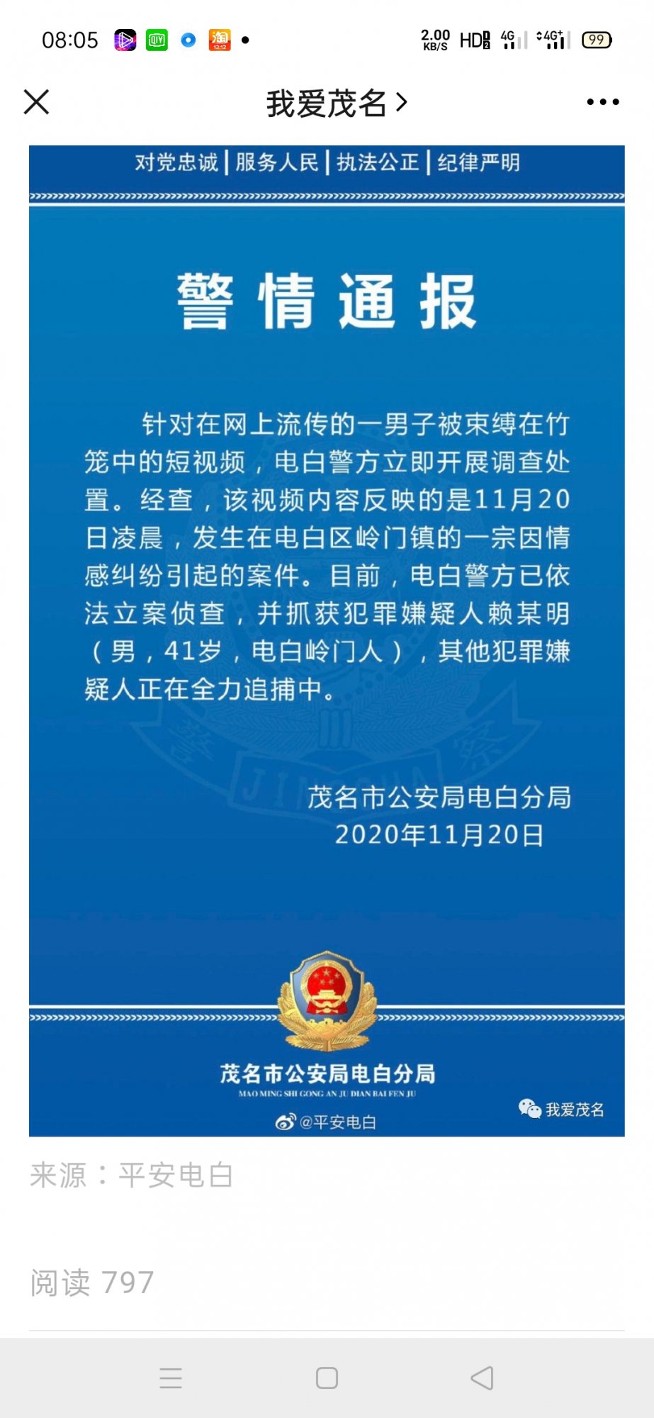 11月21日凌晨,茂名市公安局就此事发布通报。通报称,针对在网上流传的一男子被束缚在竹笼中的短视频,电白警方立即开展调查处置。