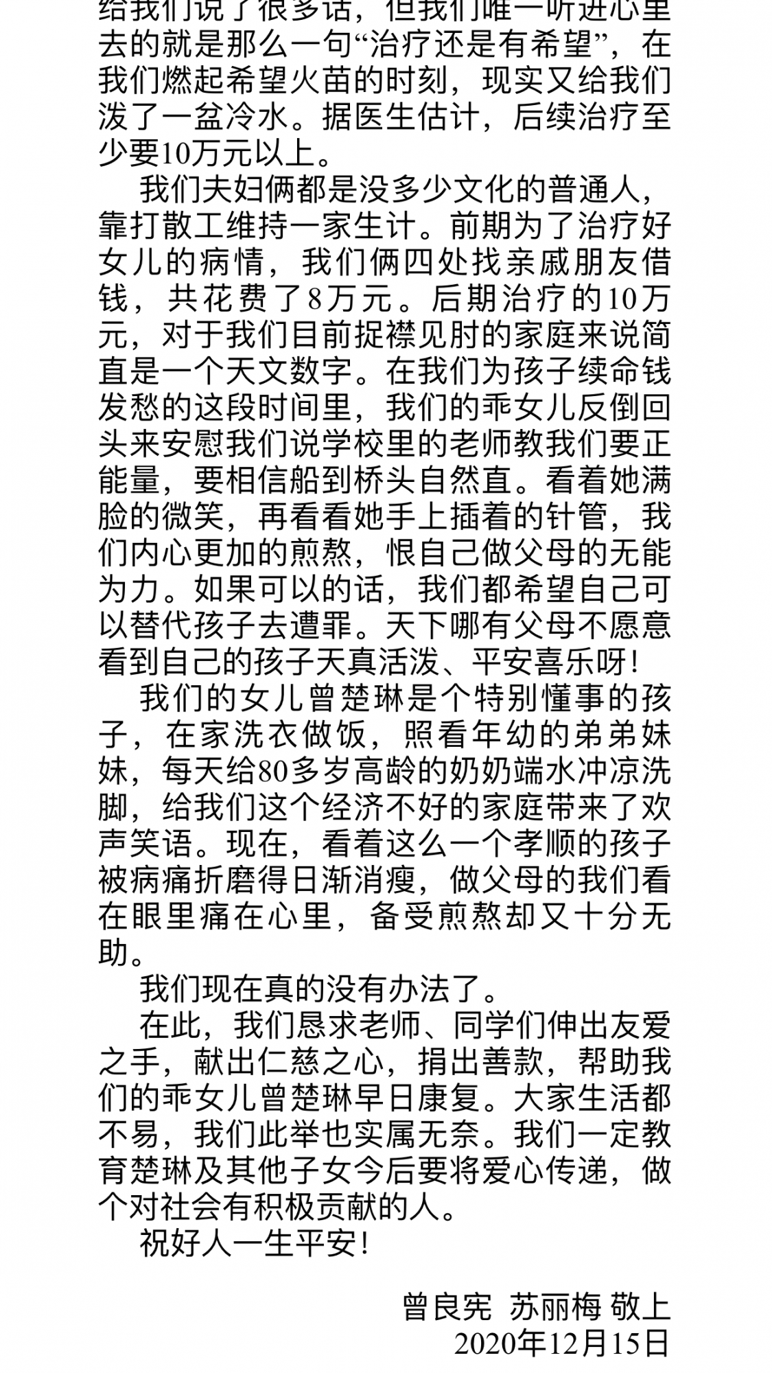 二小师生三千零人,每个家庭捐十块二十块,就算当大不了饿一顿,对该不幸小女生来说却是一个转折点。所以捐款会继续下去,一个学校就是应该帮自己学生。