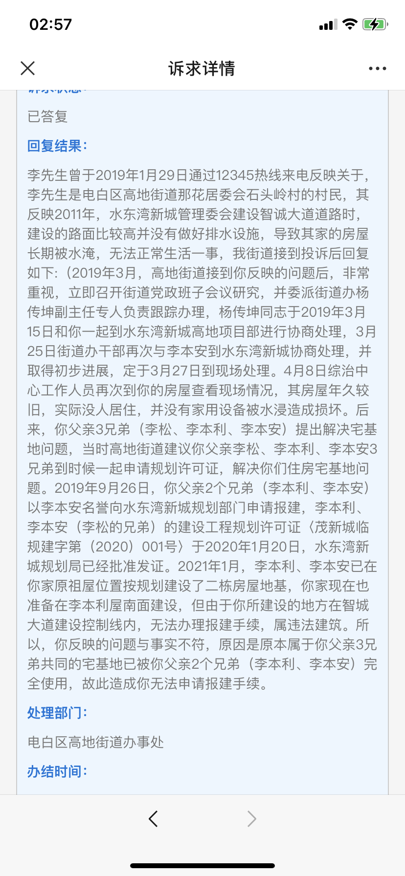 我看到以下电白区政府,电白区高地街道办的信访回复,心情复杂,难以入睡