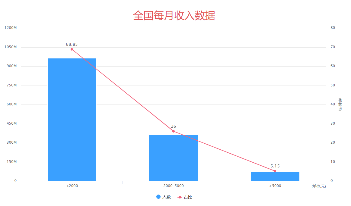 根据数据显示,全国有9.64亿人口月收入<2000,占人口的68.85%,约占七成,月收入低于1090元的有6亿人,而在这6亿人中,月收入低于1000元人群占比达92%。