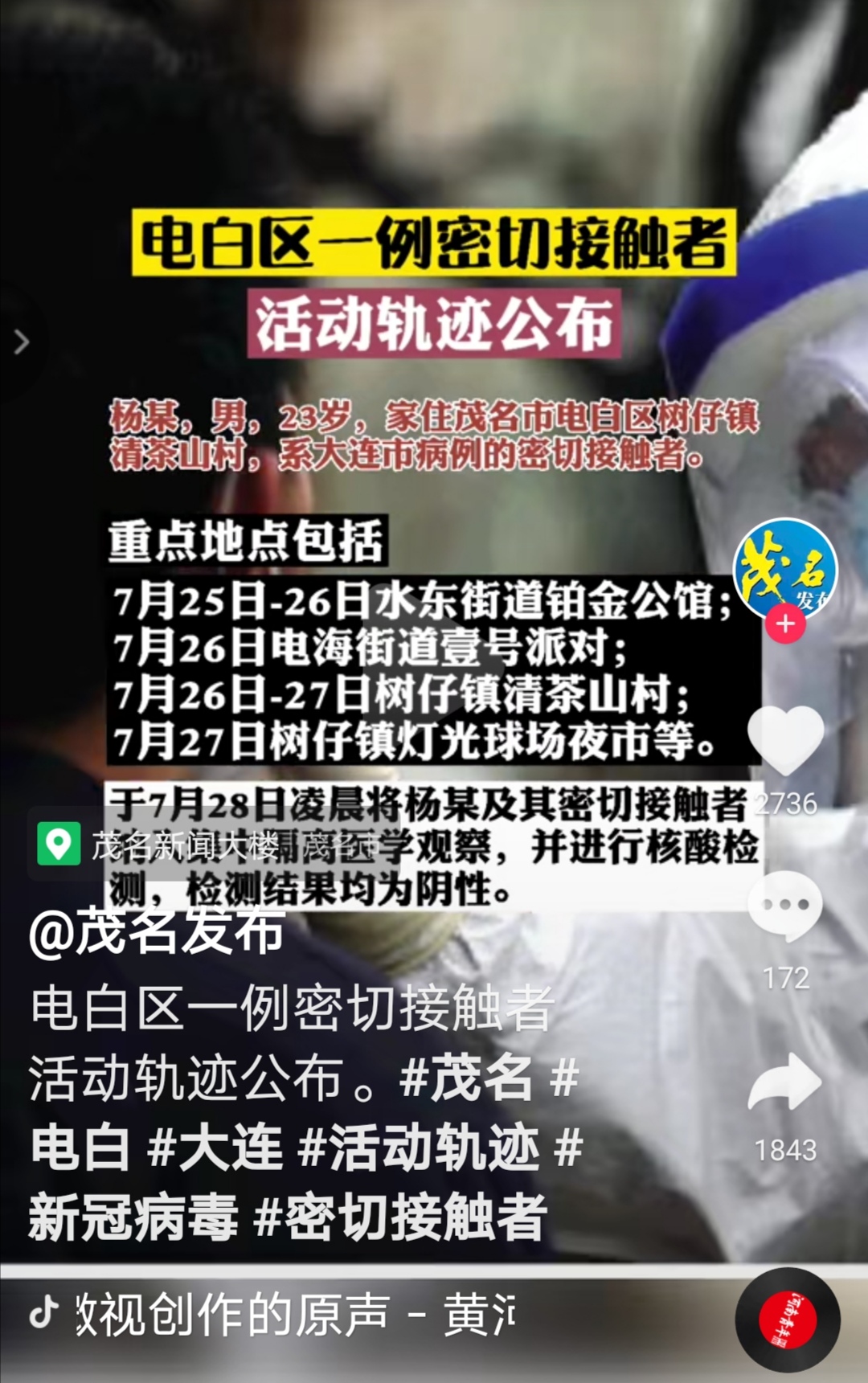 杨某,男,23岁,家住茂名市电白区树仔镇清茶山村,系大连市病例的密切接触者。