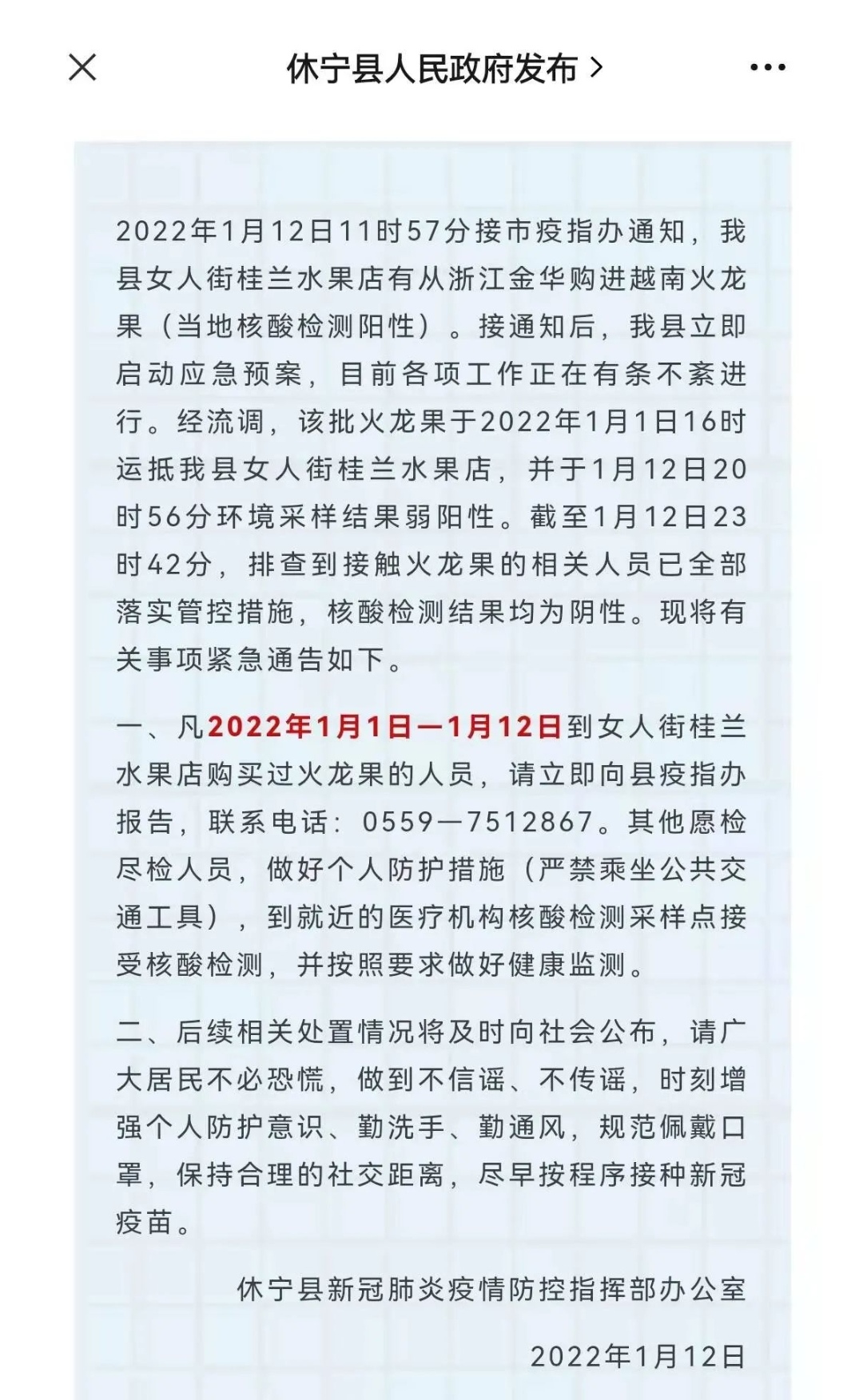 安徽省黄山市休宁县发布紧急寻人通告称,一水果店有从浙江金华购进的越南火龙果(当地核酸检测阳性)。