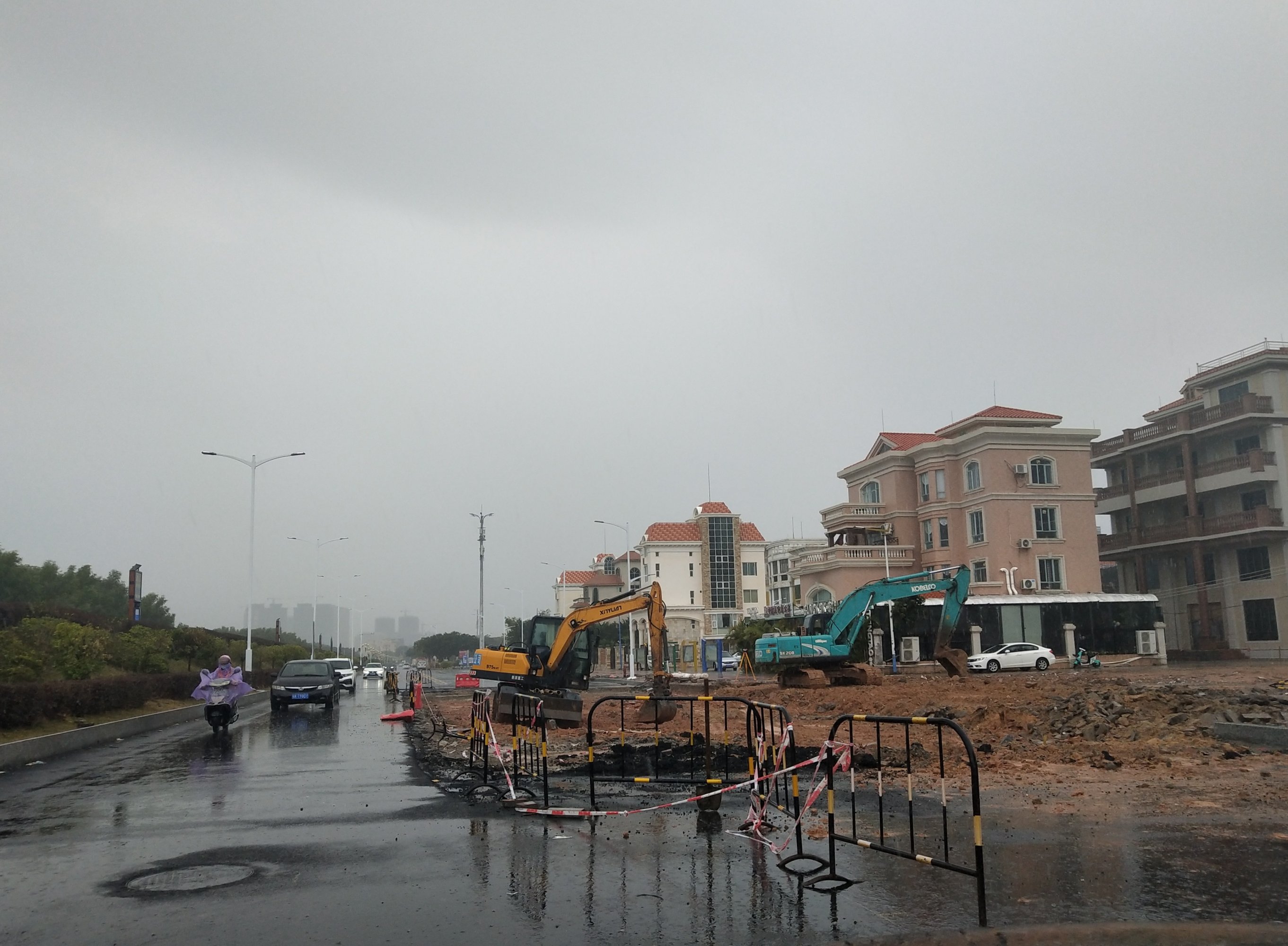 去看了下,是下了好大雨,还在持续,有些地方有浅雨水泡了,但好像暂时没见海堤路有水泡现像?以前有些地段像有水泡现像的?虽下大雨,而那些施工的机械工人等依然好像风雨不阻,而在那拆迁平整的地方,工程车像也没撤场,像有驾驶员还坐在挖掘机内,不过暂时不启动机械、、