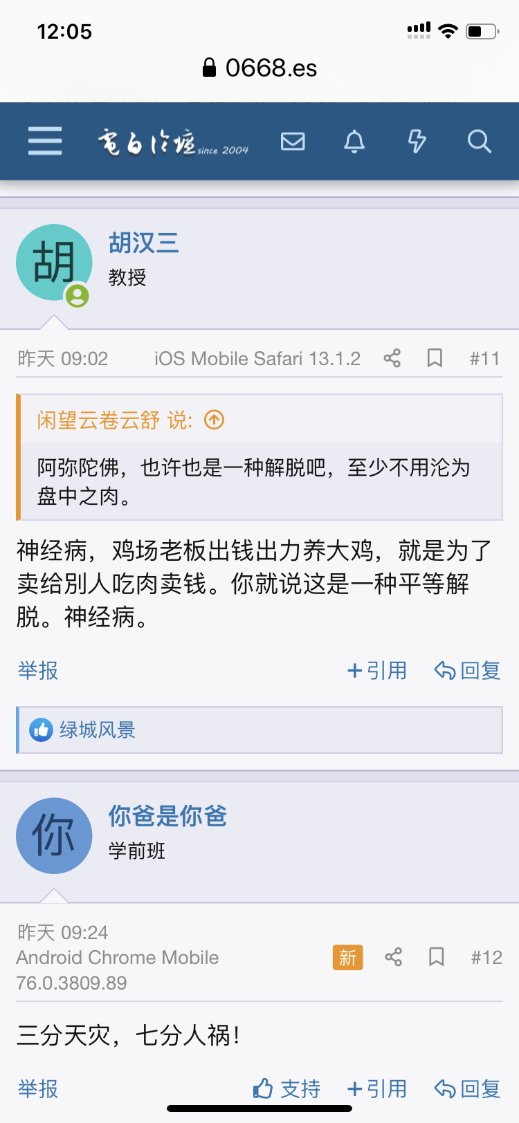 胡 胡汉三 教授 注册 2007-11-08 帖子 3,348 反馈评分 226 点数 101 2022-07-09 iOS Mobile Safari 13.1.2 #11 闲望云卷云舒 说: 阿弥陀佛,也许也是一种解脱吧,至少不用沦为盘中之肉。 点击展开... 神经病,鸡场老板出钱出力养大鸡,就是为了卖给別人吃肉卖钱。你就说这是一种平等解脱。神经病。