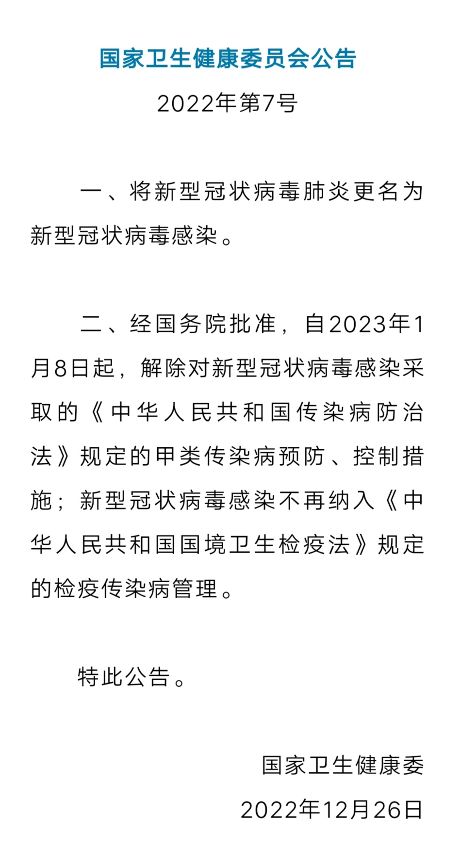 新冠肺炎更名为新型冠状病毒感染,实施“乙类乙管”
