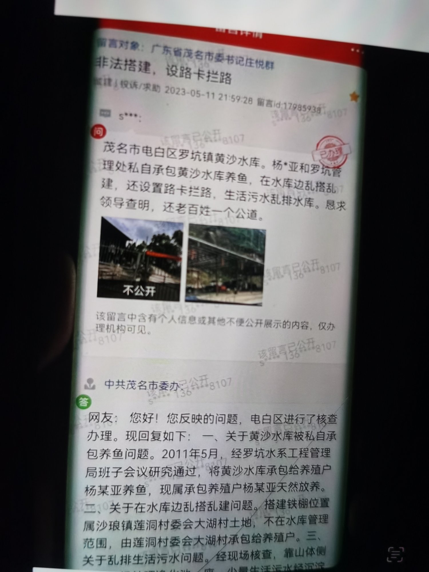 关于茂名市电白区罗坑镇黄沙水库,杨育亚和罗坑管理处私自承包黄沙水库养鱼,在水库边乱搭乱建,还设路卡拦路生活污水乱排水库。