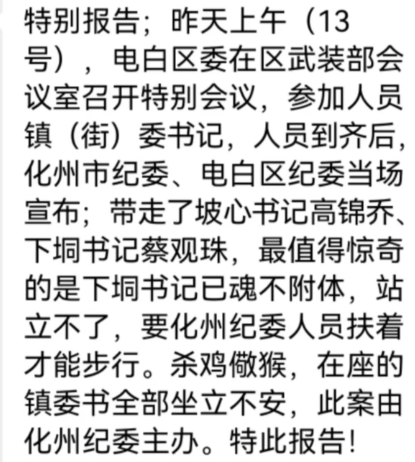 谭剑锋在电白主政所有工程都给湛江老板包了,谭剑锋在水东中学所教的学生都提拔重用了,吴伟华是谭剑锋在任期间一路提拔最高级别区委常委副书记头马,何基学生从小良镇人大主席能升任沙琅大镇当任镇长,不一会又当任沙琅镇书记!沙琅镇可是副城区呀,还有吴小良学生也是陈村街道办人大主席升任小良镇镇长等等,只要拉上关系的这批人大主席都升任了,这是过去想都不敢想的,人大主席过去都是退居二线的位置!在谭剑锋主政任期内提拔重用的书记镇长都是拉上关系重用了,可想而知高蔡书记去喝茶后,随着谭剑锋儿子在澳门洗钱赌博出事带回受审,谭剑锋还会带多少爱将手下围桌的!那就看结局吧!!!