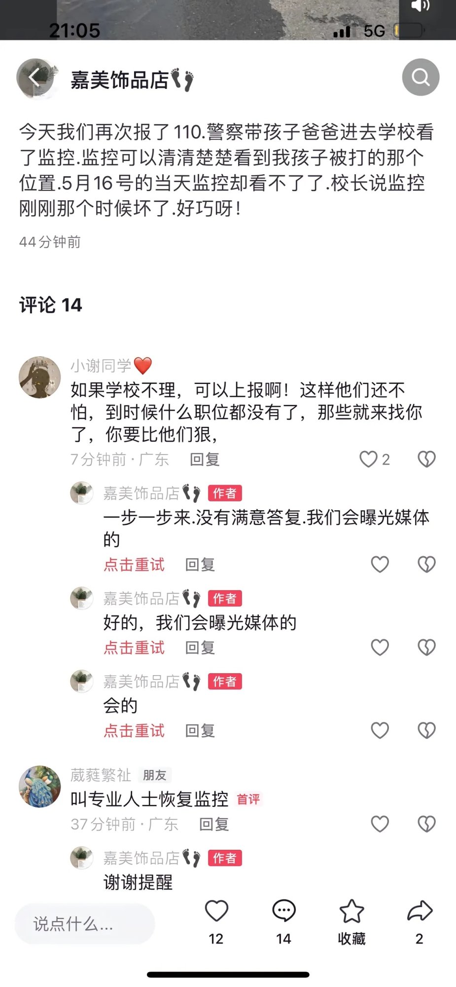 嘉美饰品 说: 你也是孩子的家长,如果你孩子在学校内被打到头破血流,现在脑震荡后遗症。对方上来就是报教育局工作身份,还爆出我们的工作地址,学校不提供监控视频,不承认霸凌反说互殴打架?既然说互殴我就去寻找证据,我们报警两次才能进校园看监控,监控开头说死角拍不到,后面又说坏了,明明一号篮球场探头清晰可见,偏偏储存硬盘刚好坏了没保存视频?我都有录音的,不是空口无凭的。还是那句话,你们说有鬼,那个鬼是谁? 点击展开... 我觉得你要让他们赔个倾家荡产,万一就这事影响了你家小孩考清华北大,怎么办