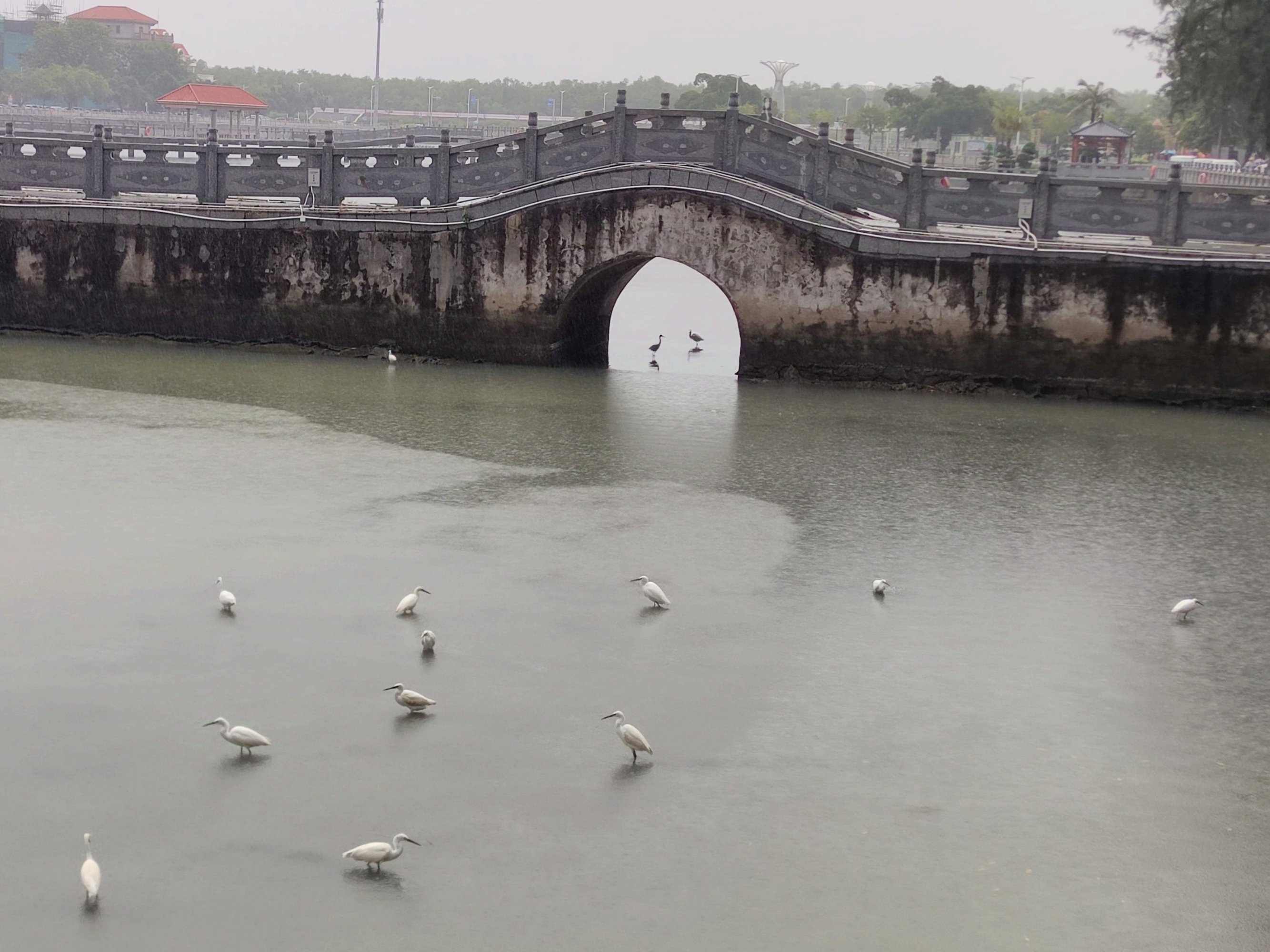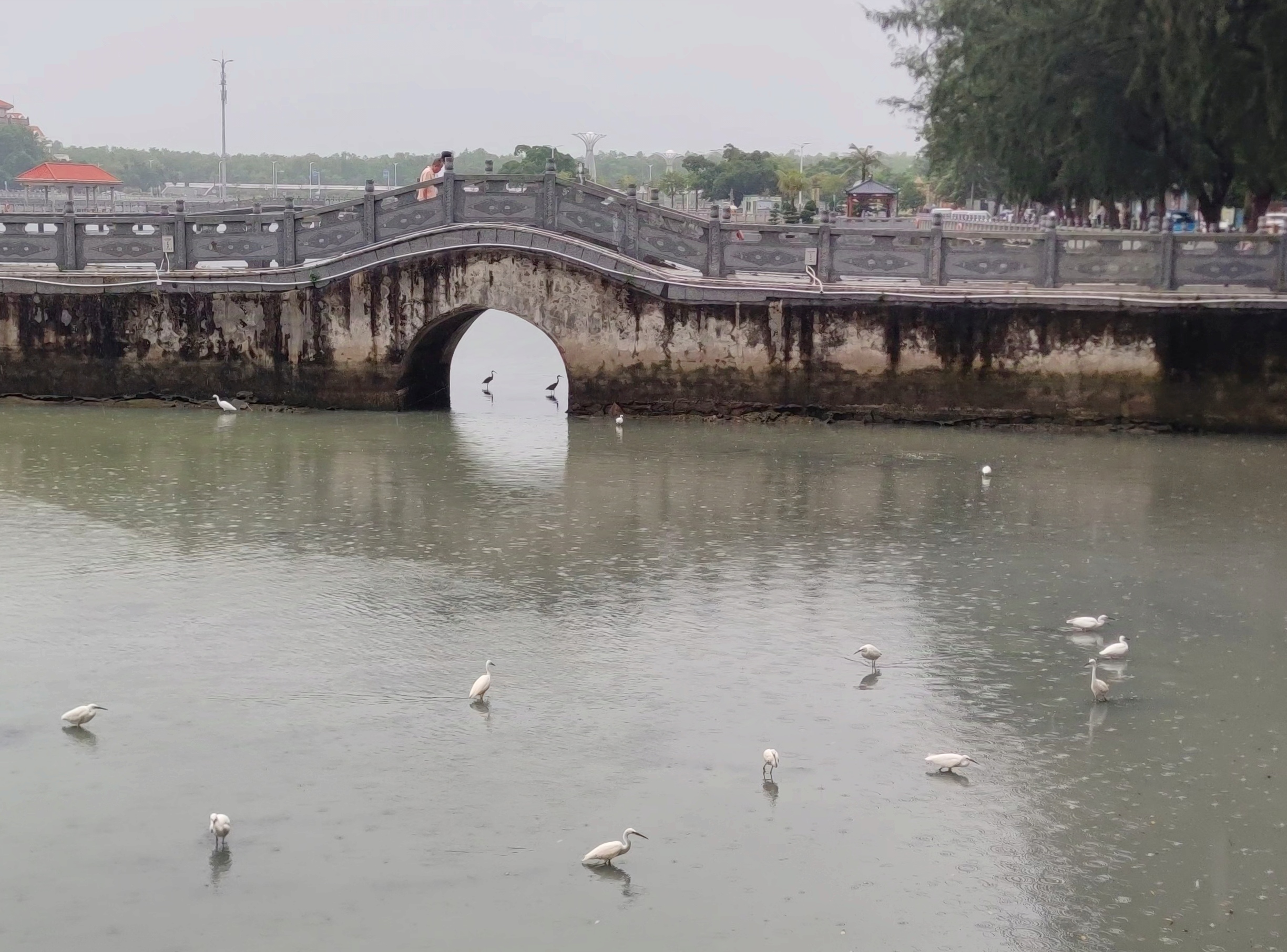 雨,担着雨具途经东湖,见到湖面有白鹭等鸟儿在湖面觅食戏闹等~