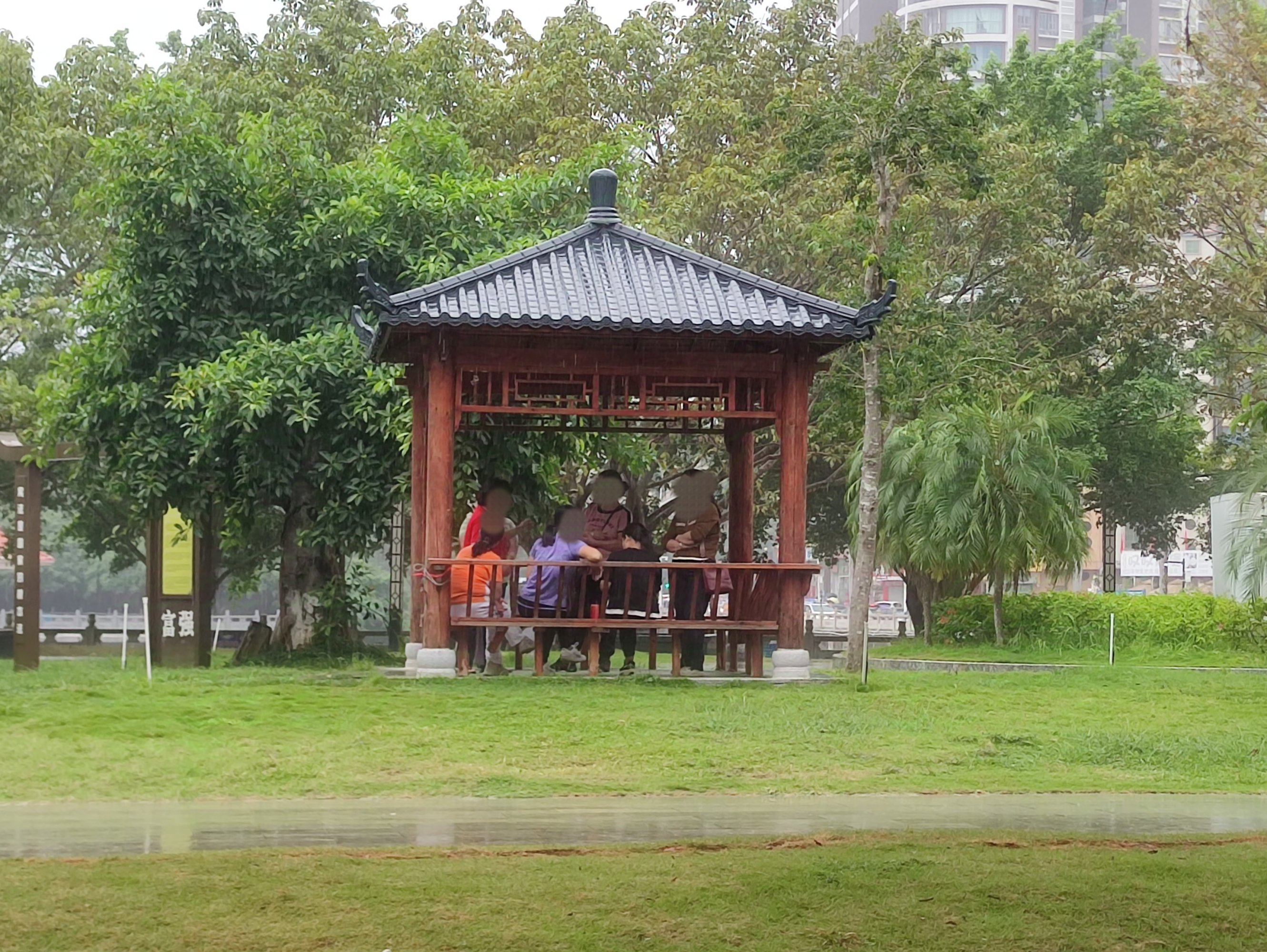 而随着雨势,下面的有些己拿出雨伞遮雨了,但依然没离开,而下面这些的进入亭子里了~