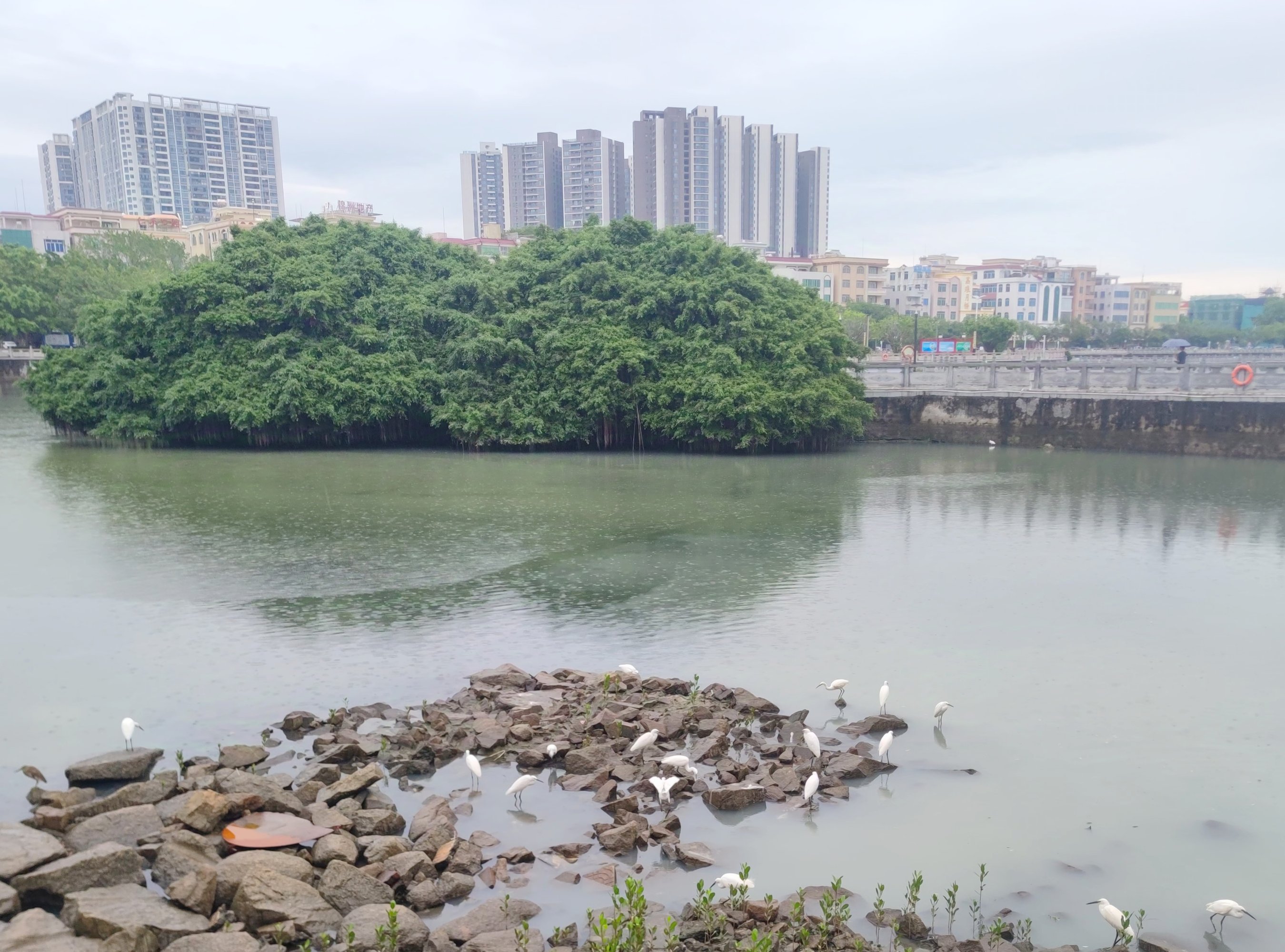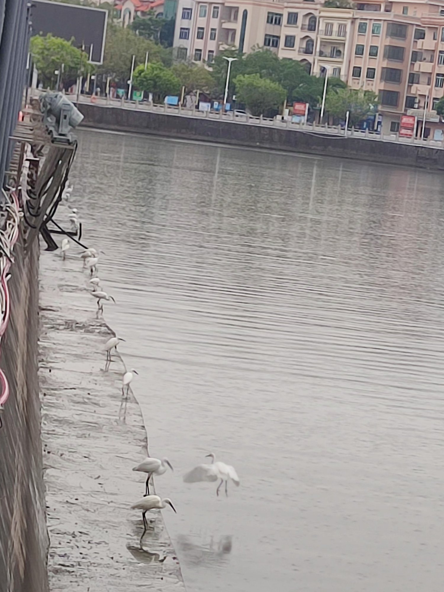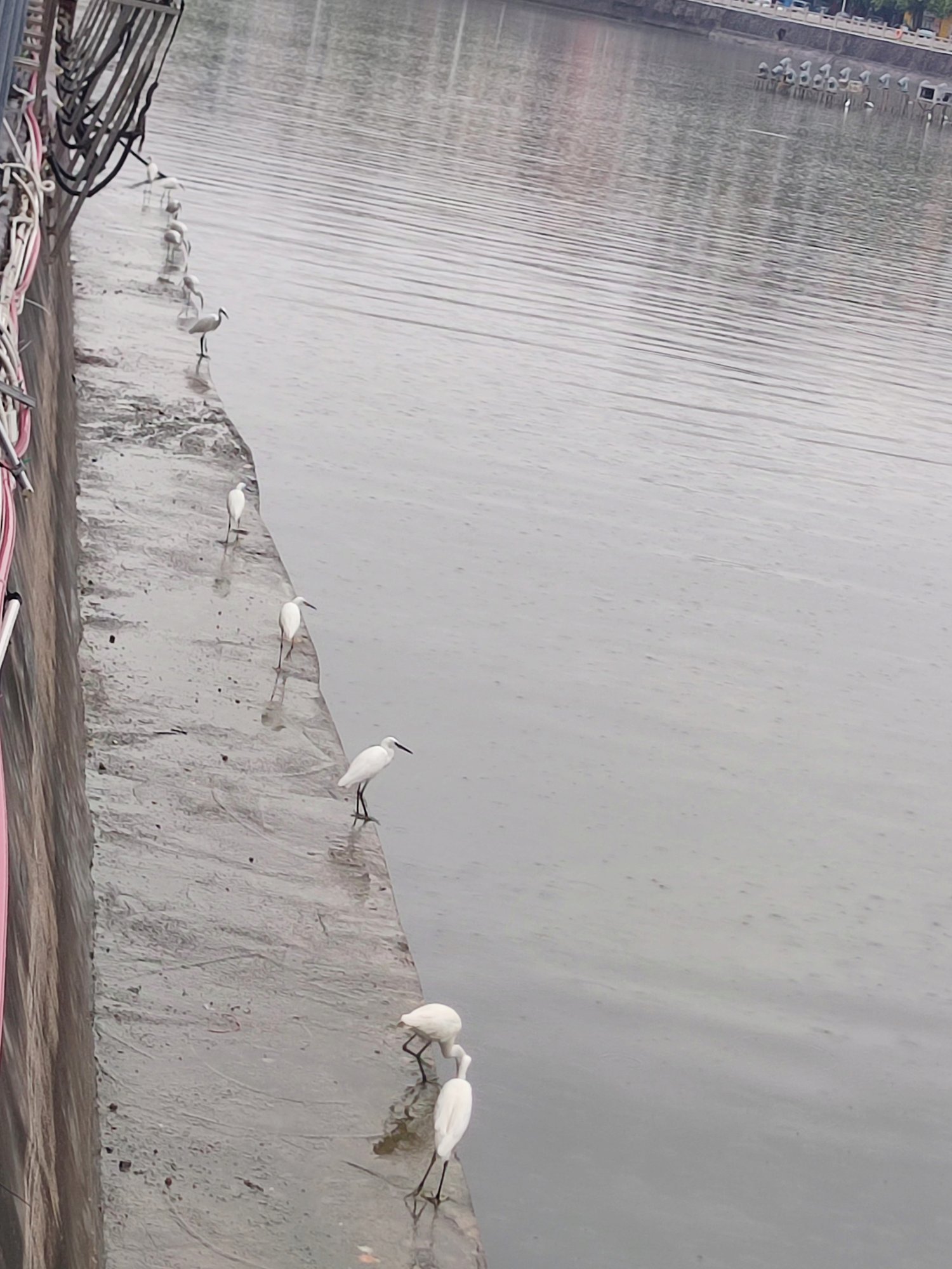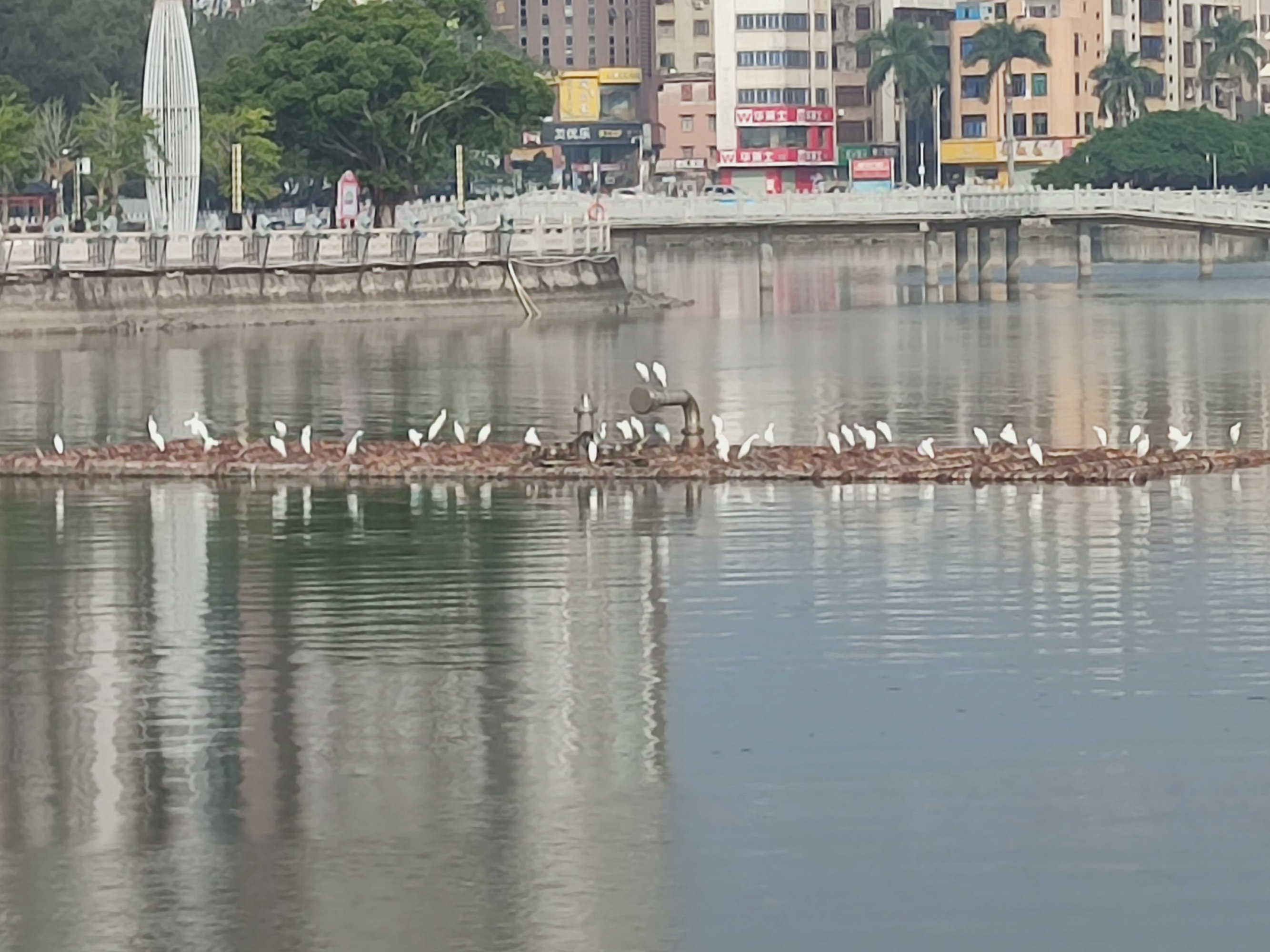 湖的另一端,有好多鹭鹭等鸟儿,在堤围边~