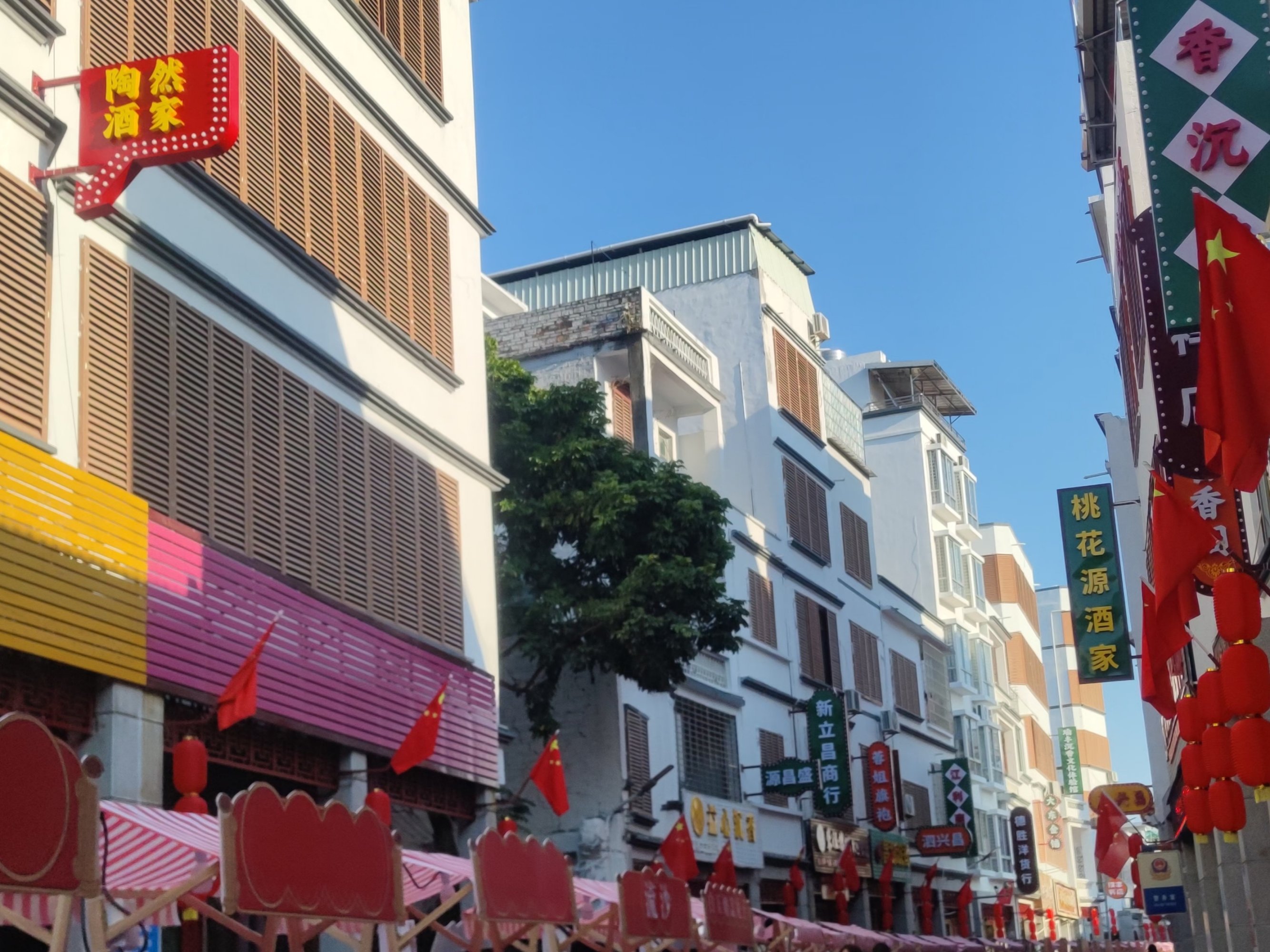 两边装了好多旧时招牌,而整条路的中间铺了一条长长的红地毯,而中间段摆设了,好多小作坊之类的地方特色物产非遗等等???