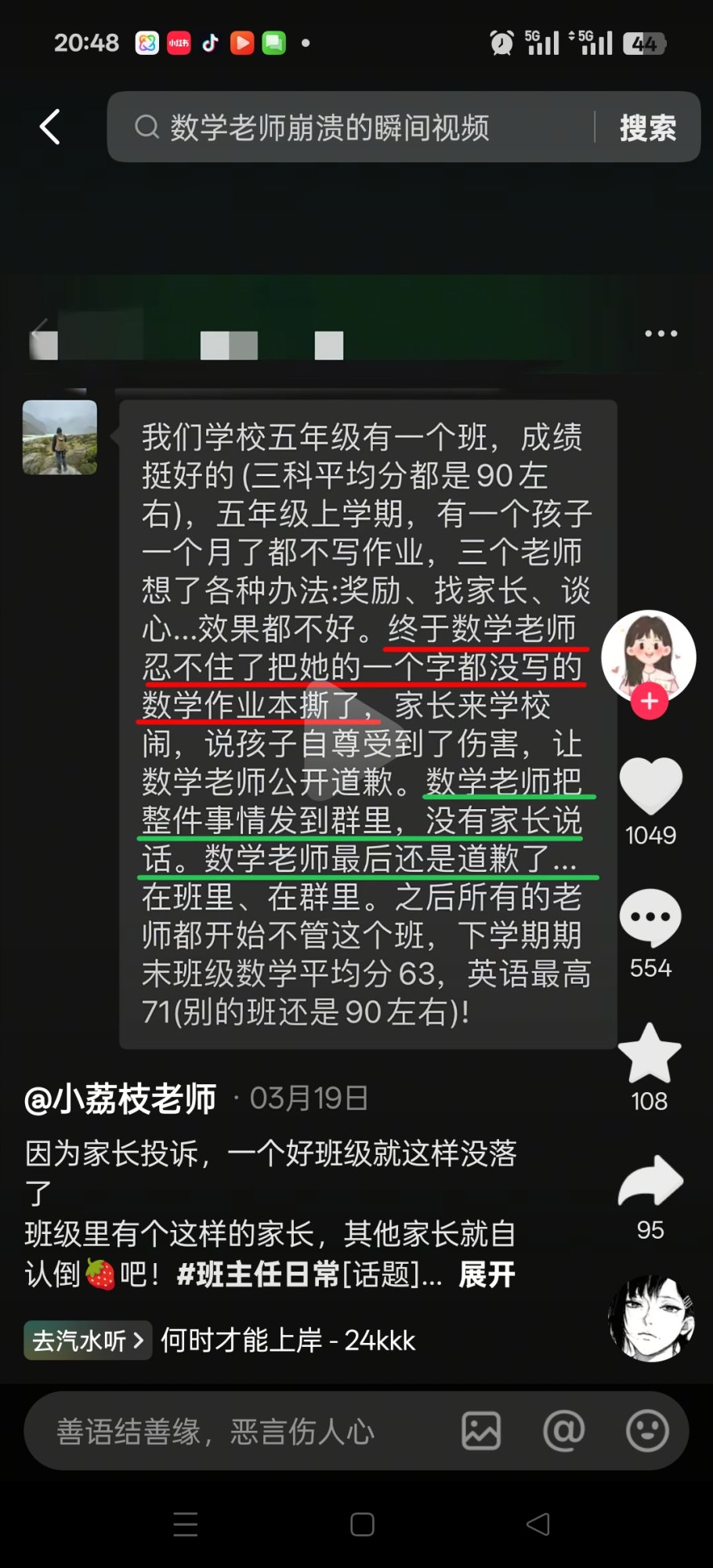 各扫门前雪,沉默的代价,以后分摊到我们后代身上的。一百个相信,当老师被霸凌,很少有当家长的站出来说话。当然也有个别坏老师,这属于客观的逻辑。 可感觉,我们跟一百年前的百姓一样麻木人人自危,在思想上好像完全没什么区别