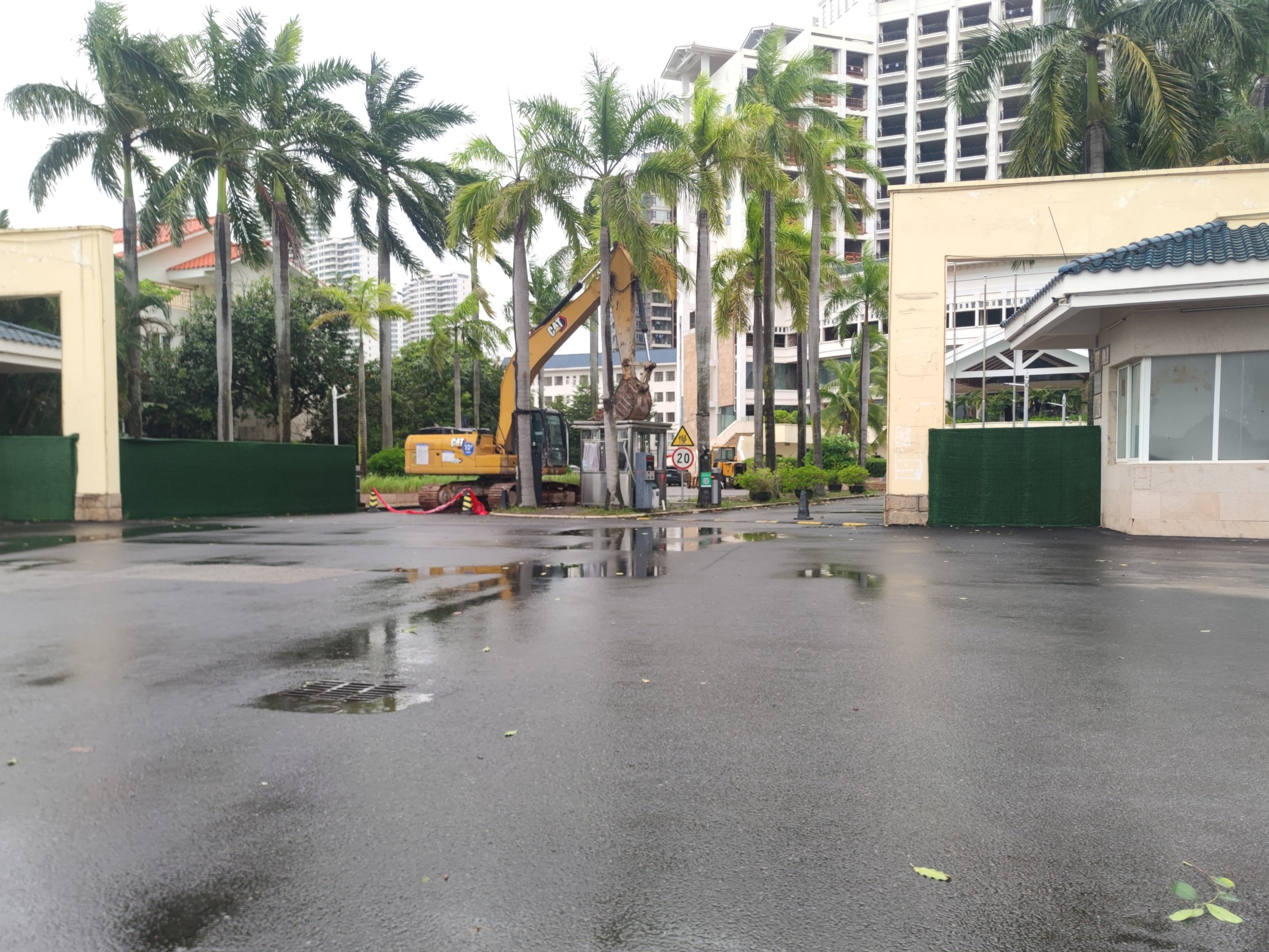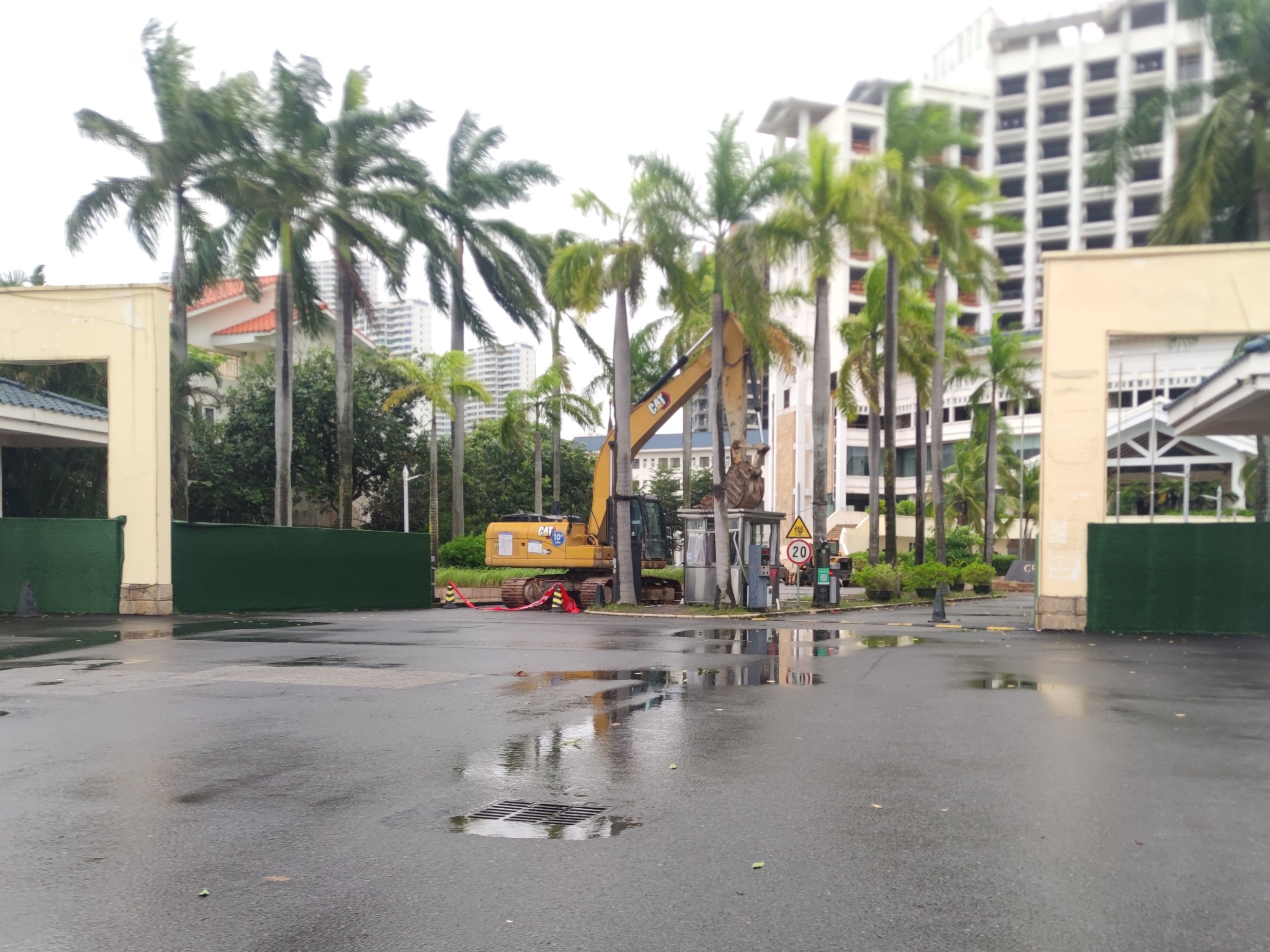 这个酒店的门岗,用一台挖机的钩背压住,可能更大的风也吹不走