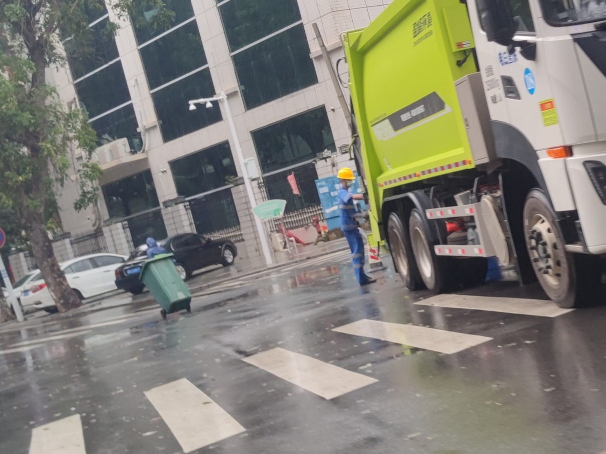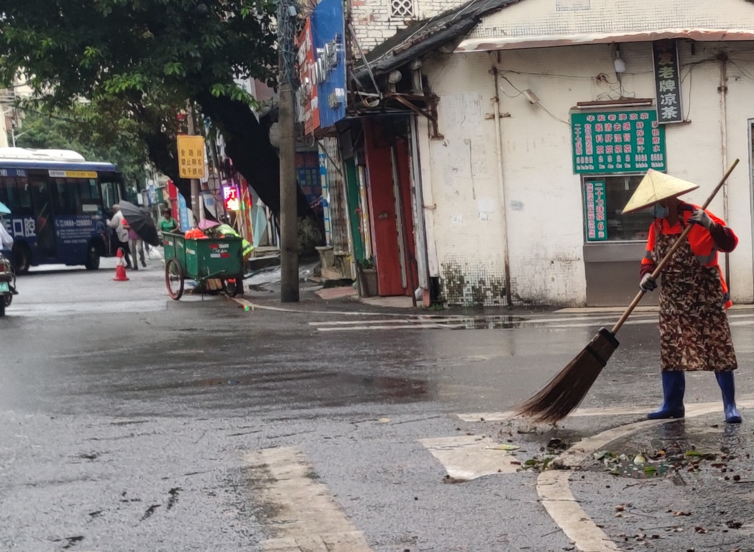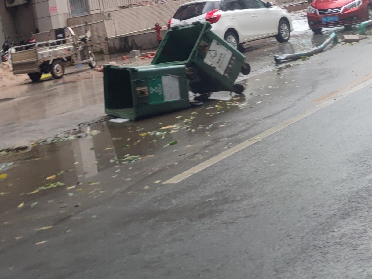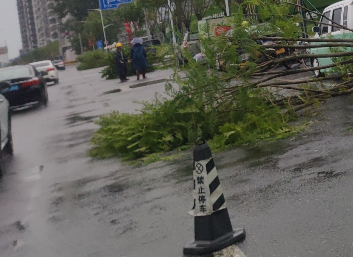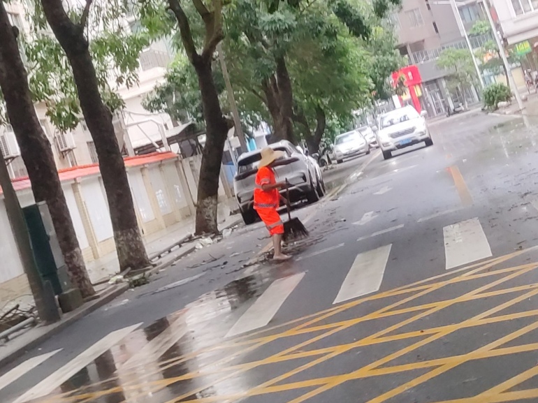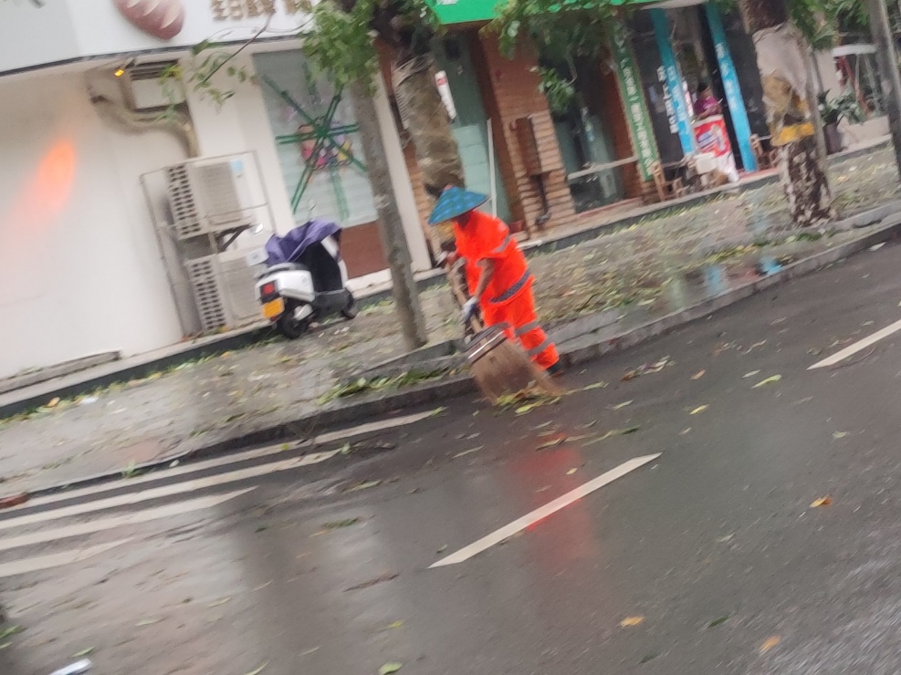 见有工人环卫工等工作人员在清理了倒树树枝树叶杂物等,诂计也还有好多地方有给台风大风吹到的