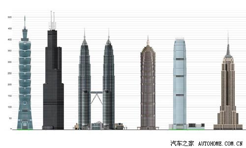 世界最高的建筑(左起):台北101大楼、芝加哥席尔斯大楼、吉隆坡双子星大楼、上海金茂大厦、香港国际金融中心、纽约帝国大厦