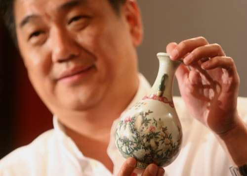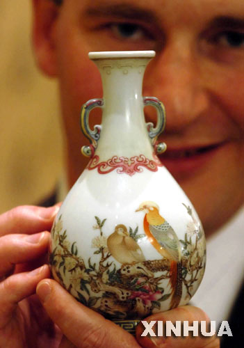苏富比工作人员在展示乾隆御制珐琅彩双耳瓶(10月20日摄)。 10月23日,全球著名拍卖机构苏富比在香港举行秋季单件专品拍卖,其中一件清朝乾隆皇帝御制的“乾隆珐琅彩‘古月轩’题诗花石锦鸡图双耳瓶”以8500万港元起价,最终以1.1548亿港元成交,从而从海外回流到中国人的手中。这个拍卖成交价格在刷新全球清代瓷器最高拍卖价的同时,也打破了亚洲地区单件艺术品拍卖的最高成交价纪录。