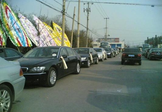 在唐山有一场空前盛大的葬礼,葬礼场面真得让所有人都目瞪口呆。大家都是车迷说说车队吧!头三辆指挥车是3辆军车,第一辆是军B的本田 然后是两辆武警的三菱越野。然后是两辆霸道的摄像车,后面是两辆黑色的旱马H2, 紧跟着这两辆旱马的后面分别是一排奔驰S55和S600,具体多少辆没有数,绝对在15辆以上,然后和奔驰并排就是一排宝马7系和奥迪A8 我只看到前三辆7系都是新款760, 这一排车和旁边奔驰车队一样长本来以为就这么多后来再往前走一转弯就看到一条马路两边停满了宝马X5越野和保时捷凯宴等顶级越野车估计光越野车队就有200米长30多辆车吧!