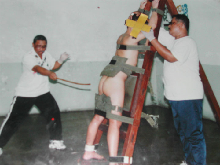 从别的网站看到的图片,挺残忍,但事实证明挺有效,大概受过一次这种刑的人一辈子也不敢再犯了。