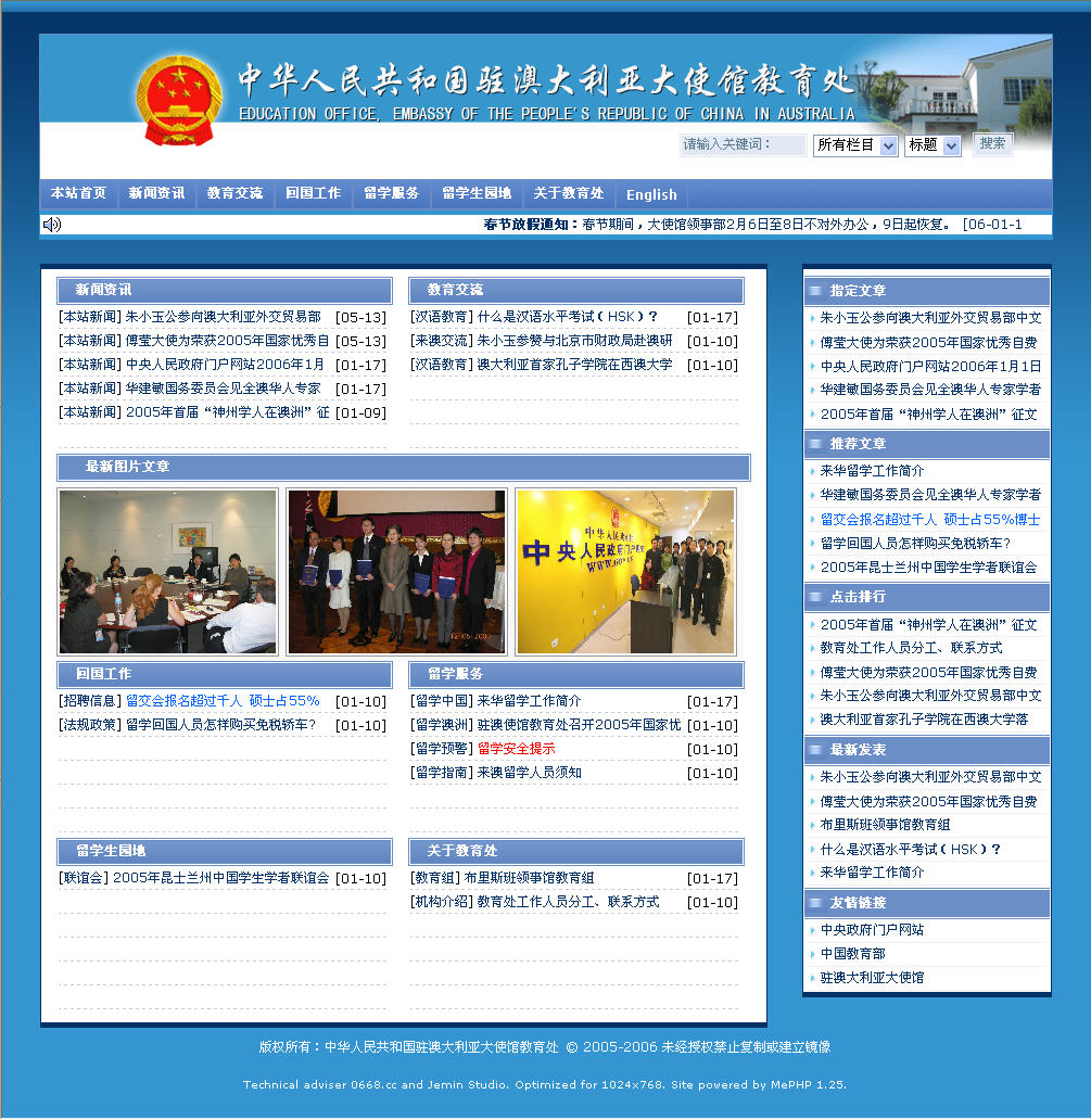 这是本站为中华人民共和国驻澳大利亚大使馆教育处义务设计的网站,基本上已经设计完毕,现在在本站服务器调试,很快可以加到正式网址(http://www.sino-education.org.au)开放访问,本站也将和驻澳大使馆建立良好的合作关系。