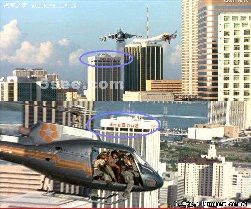阿诺驾驶的战斗机向恐怖分子发射导弹的场景,仔细看战斗机背后的大楼上有太阳银行“sunbank”字样,恐怖分子的直升机背景也是同幢大楼,可是“sunbank“几个字是弄反的,唯一的解释是剪辑的时候把胶片弄反了。