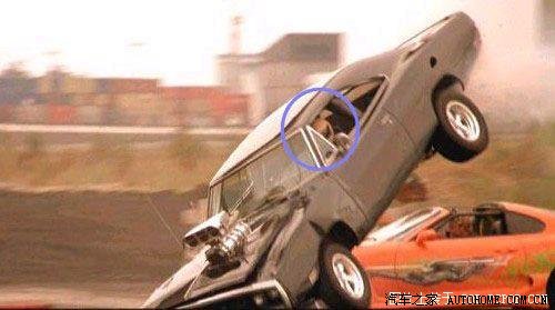 3、最后一场赛车场景中,多米尼克的车子被撞飞了,这是可以看到驾驶座里是一个戴着安全头盔的家伙。