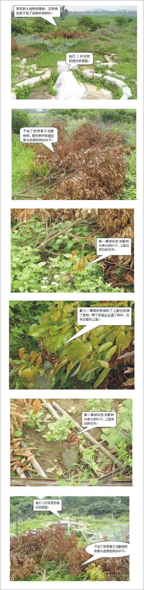 当时我因为在广州工作时间问题不能及时回去处理。在事后一个多月(2006年5月27日)我葱葱回到了家,我找到了前任乡书记问情况,他说:“我不知道是谁砍的,其实事情都过去那么久了,你也不必把事情搞大了,这样对你没好处?算了吧!”这是砍我树时在场的前任书记所说的话。
