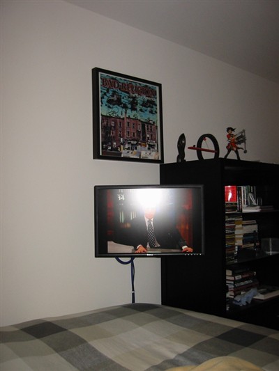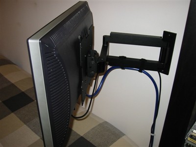 安装在床脚处的液晶显示器(真够腐败的)先在墙上安装固定架,然后将显示器置于挂架之上
