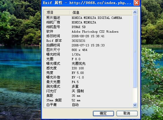 QUOTE(病房里的春天 @ 2006年08月28日 Monday, 03:57 PM) 神奇的九寨 PS:我觉的LZ有必要介绍一下器材 [snapback]1459679[/snapback] 装一个Exifshow小软件,右键点击图片,就会出现如下信息,就能知道了,我用的镜头是个18-200mm的旅游镜头,虽然很方便,但是成像质量不好,是我手头几个镜头里成像最不好的,无奈旅游贪图方便了。 [attachmentid=100548]