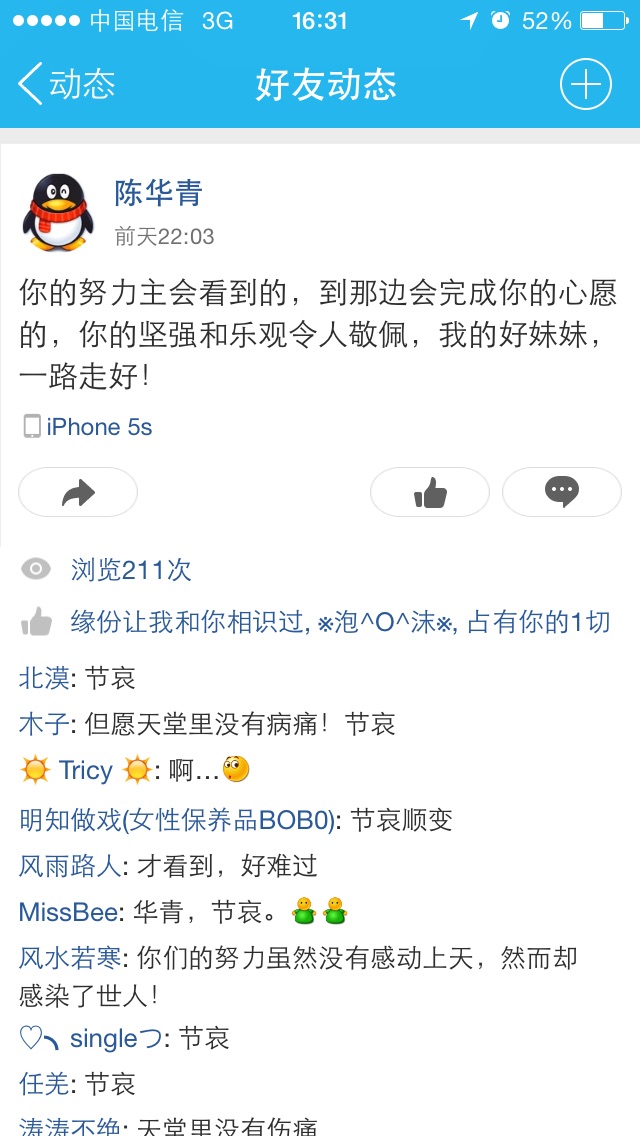 冰 冰尘 大学三年级 注册 2008-01-13 消息 892 反馈评分 0 点数 1 2015-07-24 #443 QUOTE(byronroy @ 2015年07月23日 Thursday, 04:39 PM) 事情当有始有终,所以决定还是告知诸位曾经热心相助的同乡:华青妹妹最终还是不治。 愿她走好,华青能节哀顺变! [snapback]3767265[/snapback] 忘记曾有跟过此事,看回记录,论坛诸多元老包括半个人等都是有大力支持,06年至今,华清及其妹也坚持了九年了,作为白血病案例,从发现病症到遭遇不幸历时算是我们接触过的坚持最长时间的了 节哀,天堂没有眼泪!