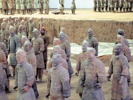 他走向一号俑坑,趁保安人员不注意,翻过护栏,跑入兵马俑阵中