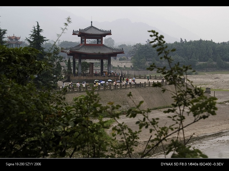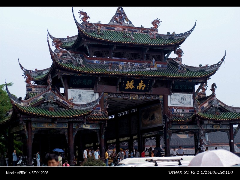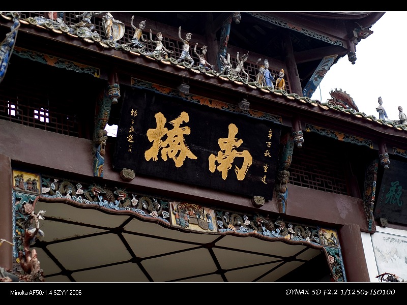 肚子饿的咕咕叫,顾不得玩,先要找点儿吃的,景区右侧迎面看到一座雄伟的古廊桥――南桥,打听了一下,说过了桥有很多小吃店