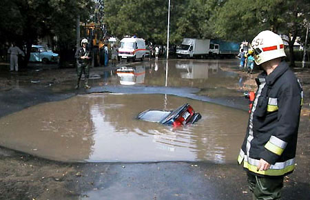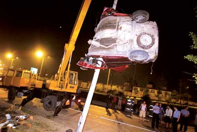 7月5日凌晨,沿成都市三环路由南向北行驶的一辆红色富康车,由于车速过快,在下大观立交桥时,撞上超车道隔离护栏,继续向前行驶,从绿化带上低飞约80米,撞上辅道护栏,接着冲上人行道将一株直径约15厘米、高8米的绿化树连根撞起,又向前冲了约6米,撞上路灯电杆,巨大的冲击力让富康车立即绕成一个圆圈紧紧抱住电杆,车内两男子当场被缠死……