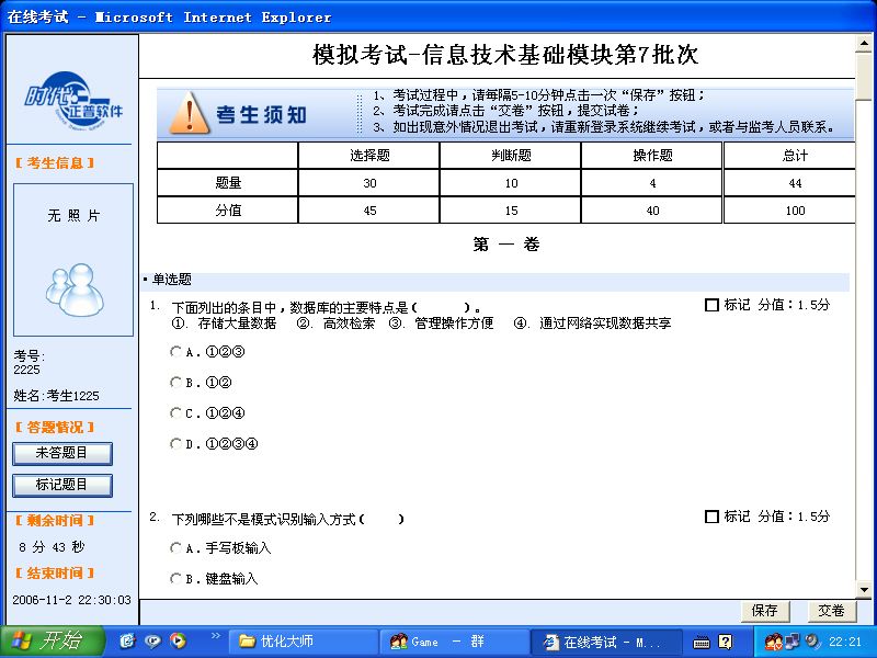进去系统后显示.因为这次是模拟考试只提供30分钟做答时间(正式的有70分钟).