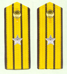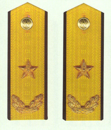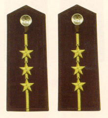 解放军海军军衔――将官 (1):海军上将为海军正大军区职军官的主要军衔,也是我军现行军衔制中海军最高军衔,一般只授予海军司令员、海军政治委员。其主要 标志为:金****肩章两佩镶有代表海军的黑色边饰,肩章底版上缀有仿刺绣金色枝叶和三颗金色星徽。