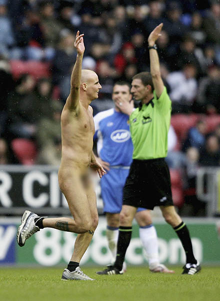 [attachmentid=126245] 在本轮英超联赛维甘对阵富勒姆的比赛中,一名狂热的光头球迷成功冲破所有保安的围追堵截,赤裸全身冲进球场,开心地做出了一个和裁判相似的动作,而维甘队球员在远处看到这幽默的一幕也不禁掩嘴偷笑。