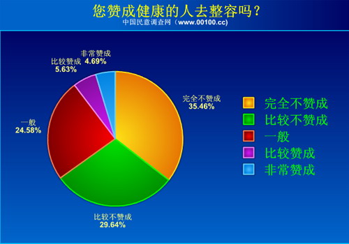 为此中国民意调查网过网上调查对比发现,完全不赞成的人约占35.4%,比较赞成的人约占29.6%,一搬的人约占24.5%,比较赞成的人约占5.6%,非常赞成的人约占4.6%。从调查数据上来看,将近有65%的人是不赞同去“改造”的,而赞同的人却只有10.5%。差距之大,但是仍然有人冒着“改造”后所产生的“后遗症”、“不良影响”坚持整容,其后果可想而知。